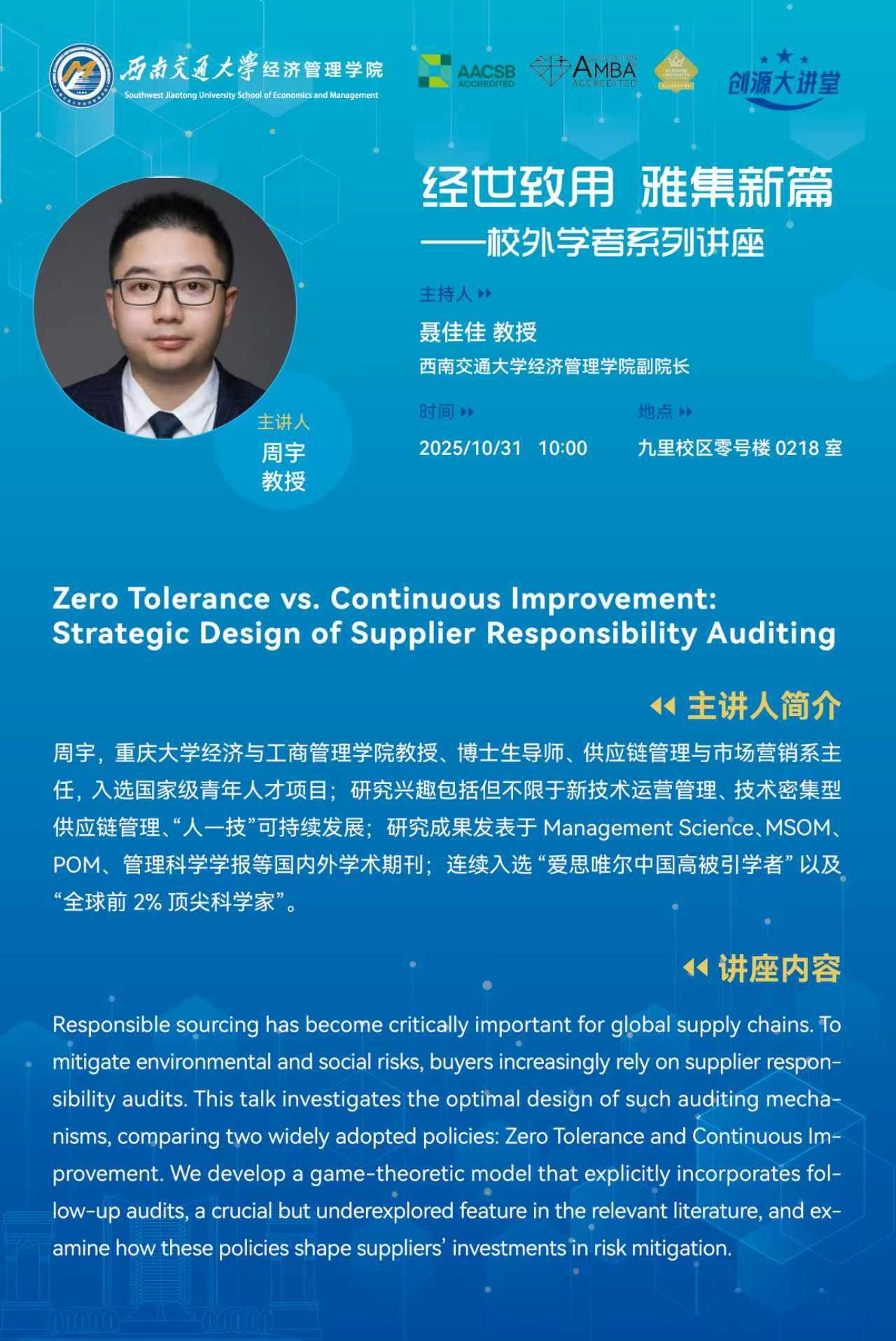 Speaker ProfileProfessor ZHOU Yu is the Head of the Department of Supply Chain Management and Marketing at the School of Economics and Business Administration, Chongqing University. He is a recipient of a national-level young talents program.His research interests include operations management for new technologies, technology-intensive supply chain management, and sustainable human-technology development....