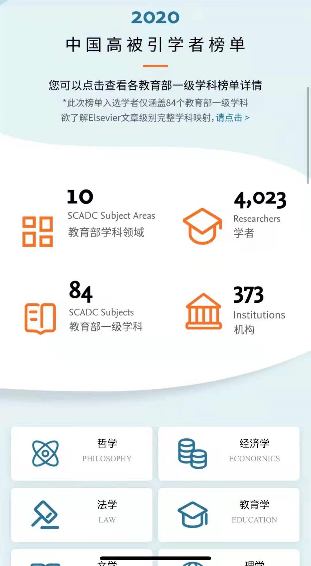 On April 22, Elsevier released the 2020 "Highly Cited Chinese Researchers" list. This list uses the world's authoritative citation and index database “Scopus” as the statistical source of the scientific research achievements of Chinese scholars, and uses the method developed by Shanghai Ruanke Education Information Consulting Co., Ltd. to analyze the performance of scientific research achievements of Chinese scholars. For the first time, the list adopted the first-level subject mapping of the Ministry of Education, covering 84 first-level disciplines in 10 subject areas of the Ministry of Education, and a total of 4,023 scholars from 373 institutions were selected.