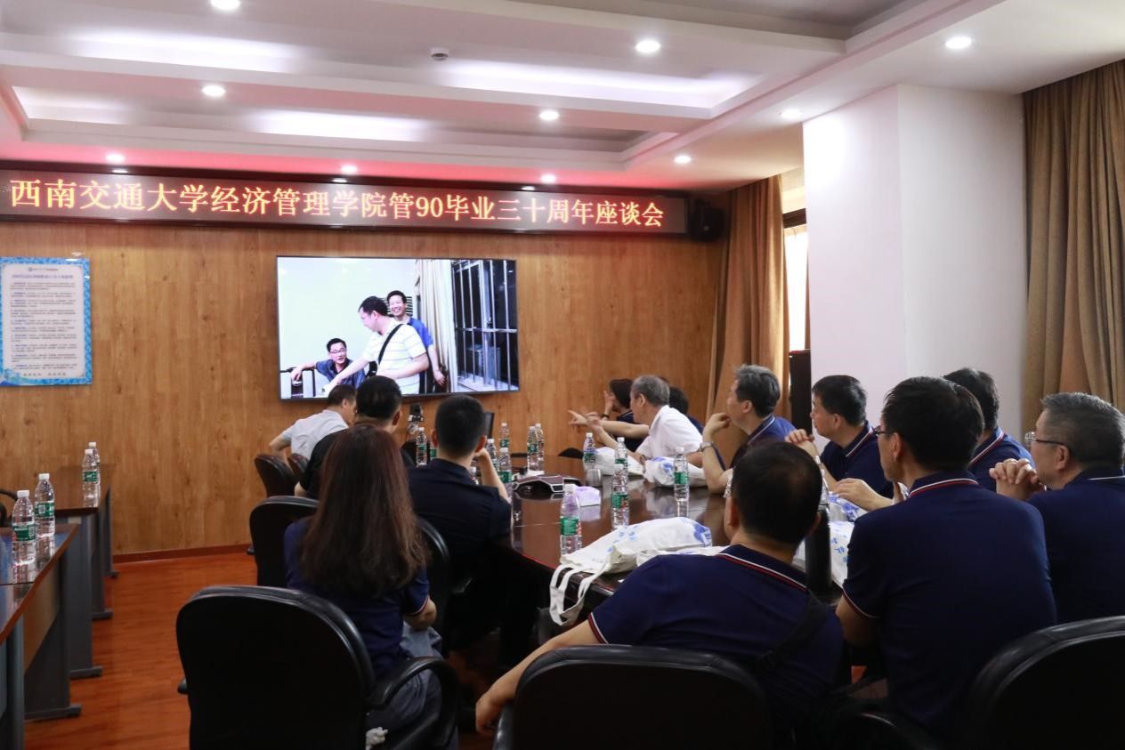 管90毕业三十周年座谈会在九里校区0号教学楼0607会议室举行。出席本次座谈会的有学院党委书记郭强、院长韩科、综合事务办公室主任何鹏、学院教师代表张震宇,以及时任管理工程系党总支副书记梁锦唐和13名从海内外返校齐聚在一起的管90校友们。