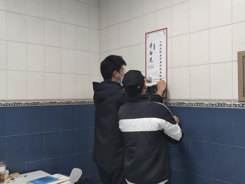 学生会工作人员在自习室的墙上贴上了名言警句,以榜样的力量促进同学们奋发向上。同时,设置了时间提醒,在自习室内放置小日历,为考研或四六级考试进行倒计时提醒,以此激发同学们学习的动力。另外,设置了书籍暂存处,大家在暂离时可以将难以带走的书籍暂存在书架上,便于大家对多门功课的复习。