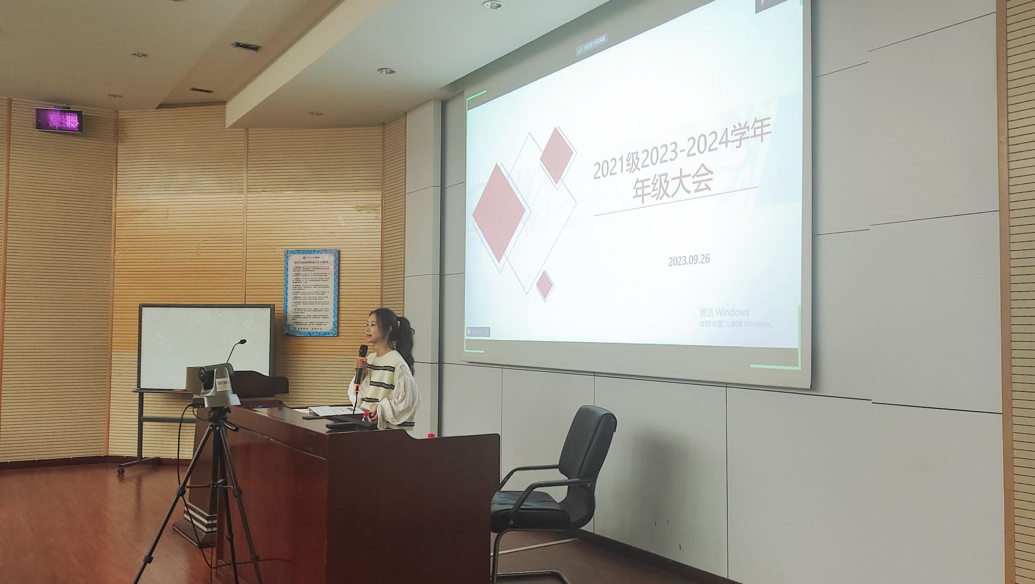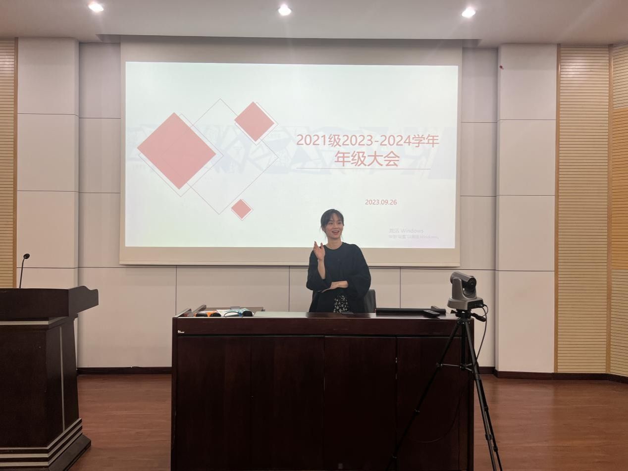 本科2021级在九里校区J0215教室举行年级大会。本次大会采取“线上+线下”相结合的方式举行,由本科2021级辅导员张先凌、钟文婷主持,2021级全体学生参加。