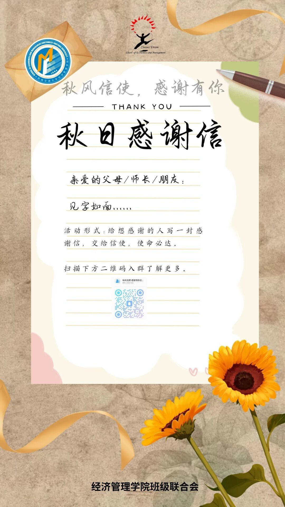 班级联合会10月10日至17日举办“秋风信使,感谢有你”主题心理活动,帮助同学们积极表达、关爱他人,进一步弘扬社会正能量,从而助力同学们的心理健康发展。