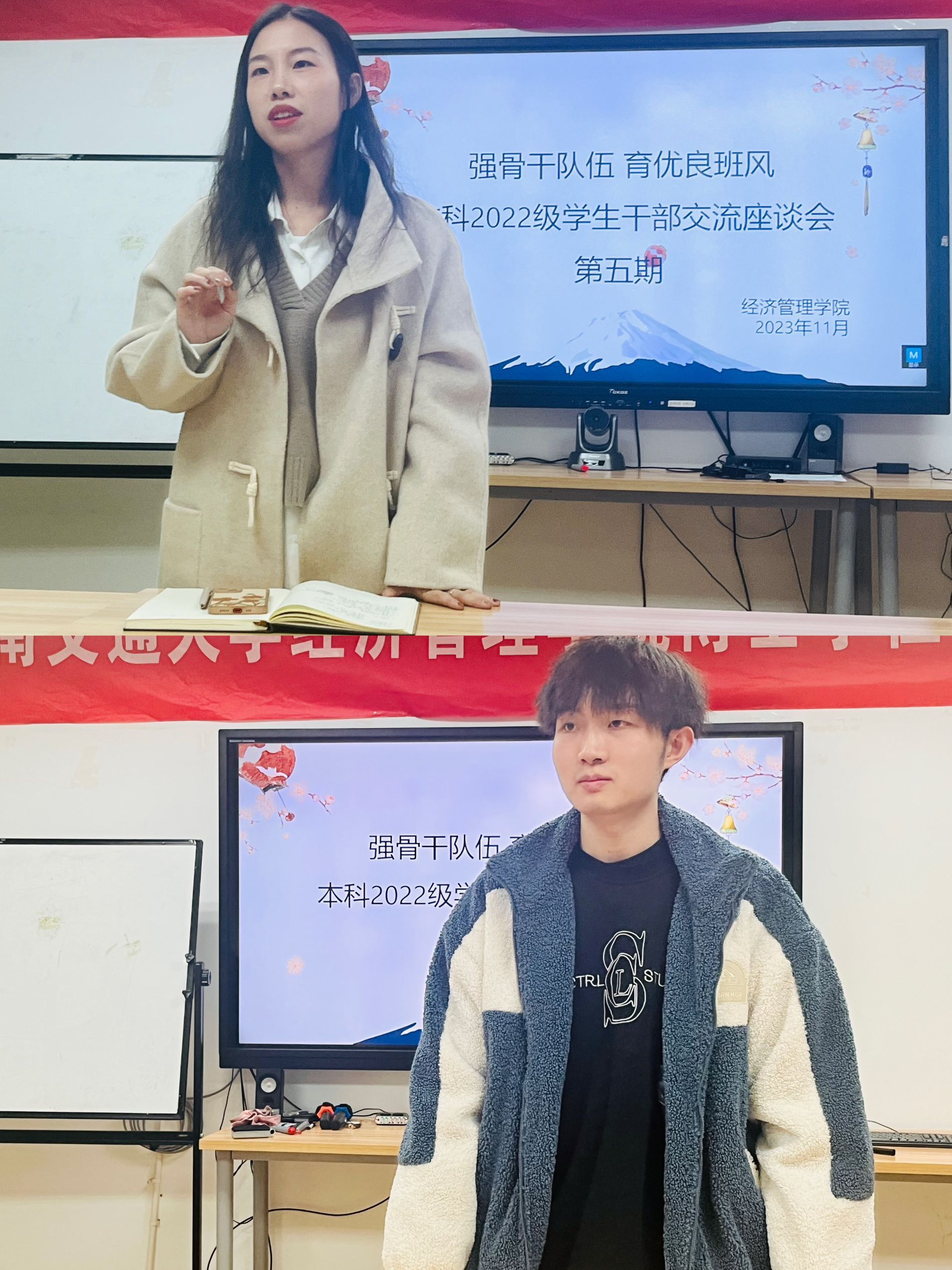 本科2022级“强骨干队伍 育优良班风”学生干部交流座谈会第五期在J0411会议室举行,本科2022级辅导员薄慧、贺小轩及全体班长参加,本期座谈会由辅导员贺小轩主持。