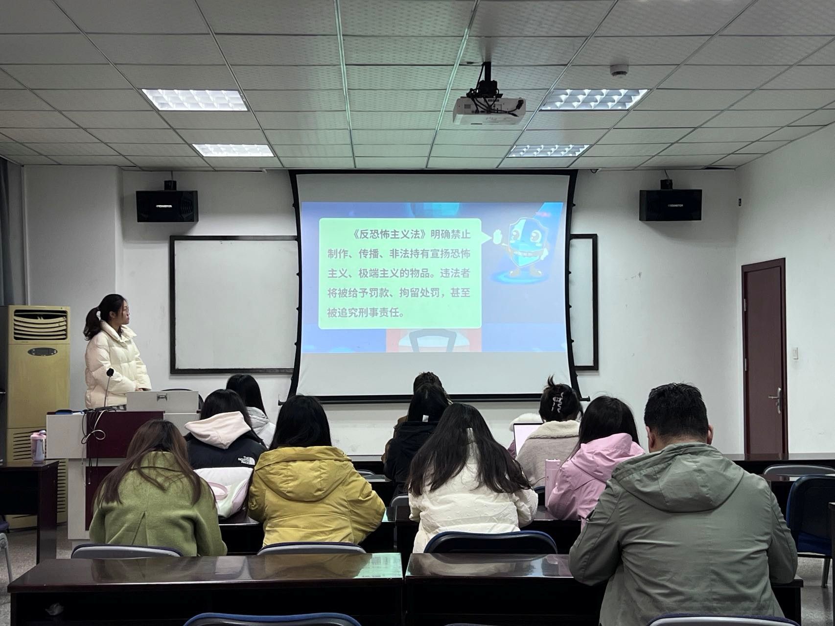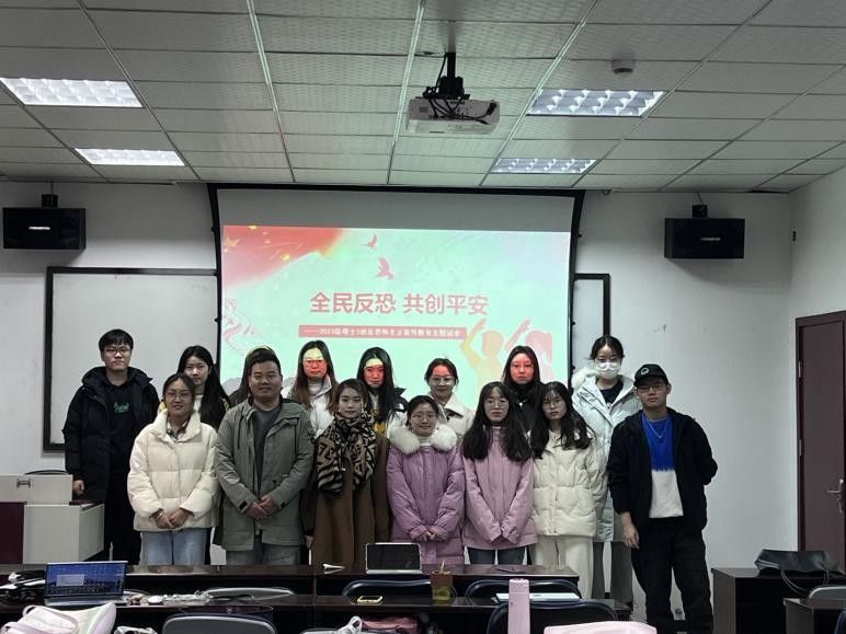 23级硕士3班认真筹备,在0号教学楼0317顺利举办了认真学习《反恐怖主义法》专题班会,班会由班长肖晶晶与宣传委员丁洁共同主持,研究生辅导员李勇、班级全体同学参与。
