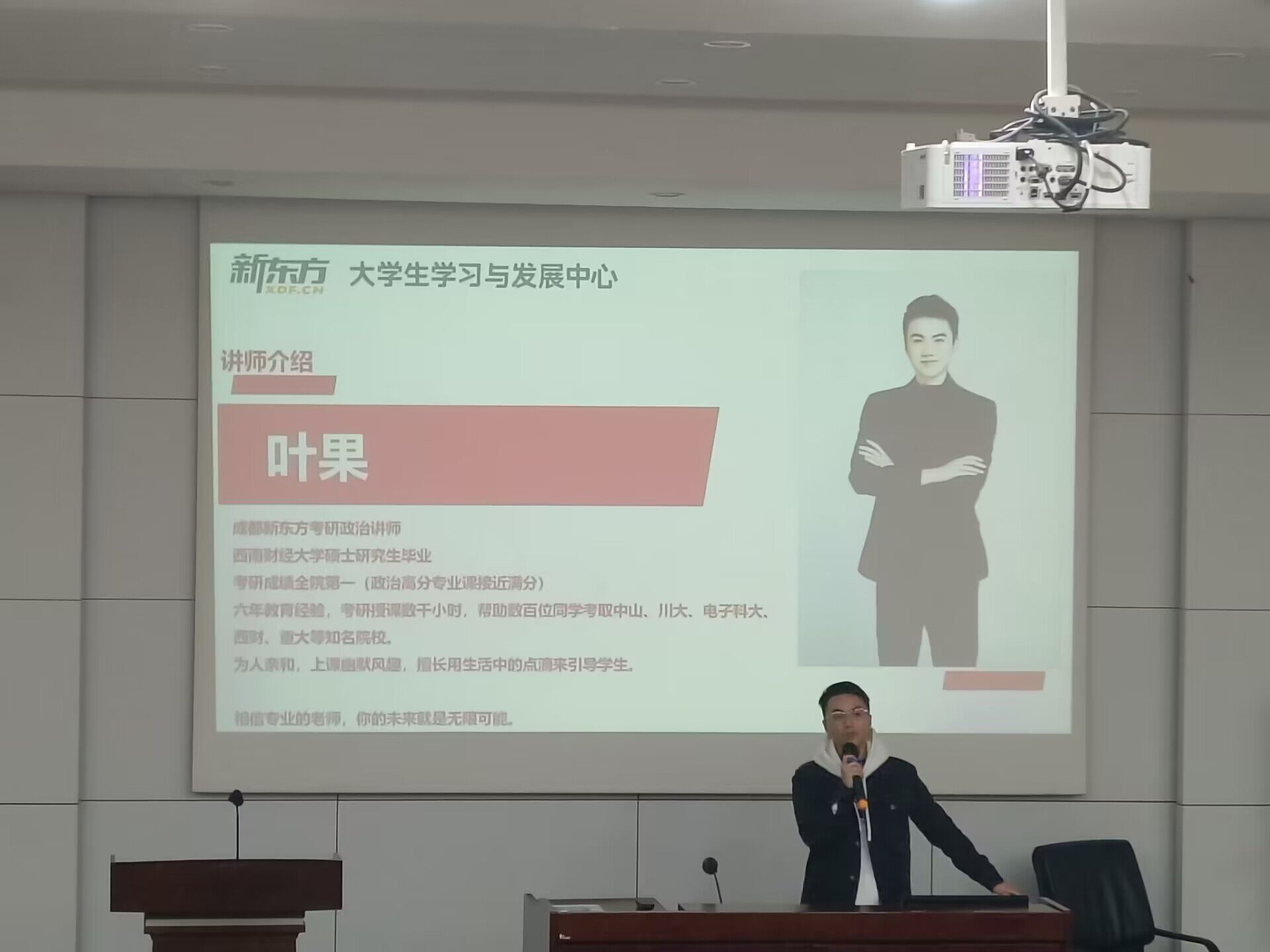 学生明确考研目标,做好考研规划,近日学院邀请了新东方大学生学习与发展成都中心的叶果老师,就考研的重要性、适合考研的学生类型、各专业考研形势分析、择校指导以及复习安排等方面开展考研规划指导讲座。