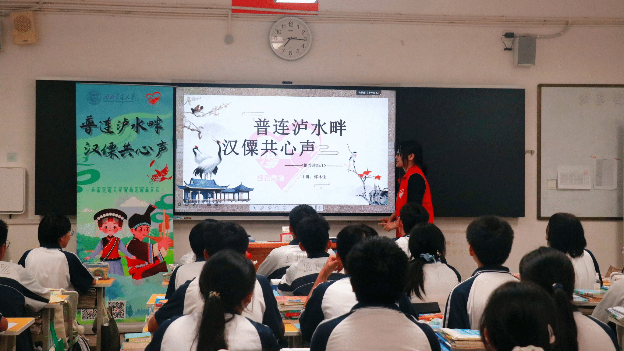千言万语,九州之情。在用普通话介绍家乡的活动中,学生们踊跃参与,纷纷讲述傈僳族的刀杆节、漆油鸡等。在提问环节,同学们将自己的困惑与理想都说与团队成员们听,大家对大学生活都有着无限的憧憬与向往,希望自己也能成为一名大学生,有朝一日能够回到家乡,为家乡做出自己的一点贡献。面对同学们的疑惑与理想,团队成员鼓励同学们积极努力、奋发有为,学习好科学文化知识,慢慢提升自己,去完成自己的理想。