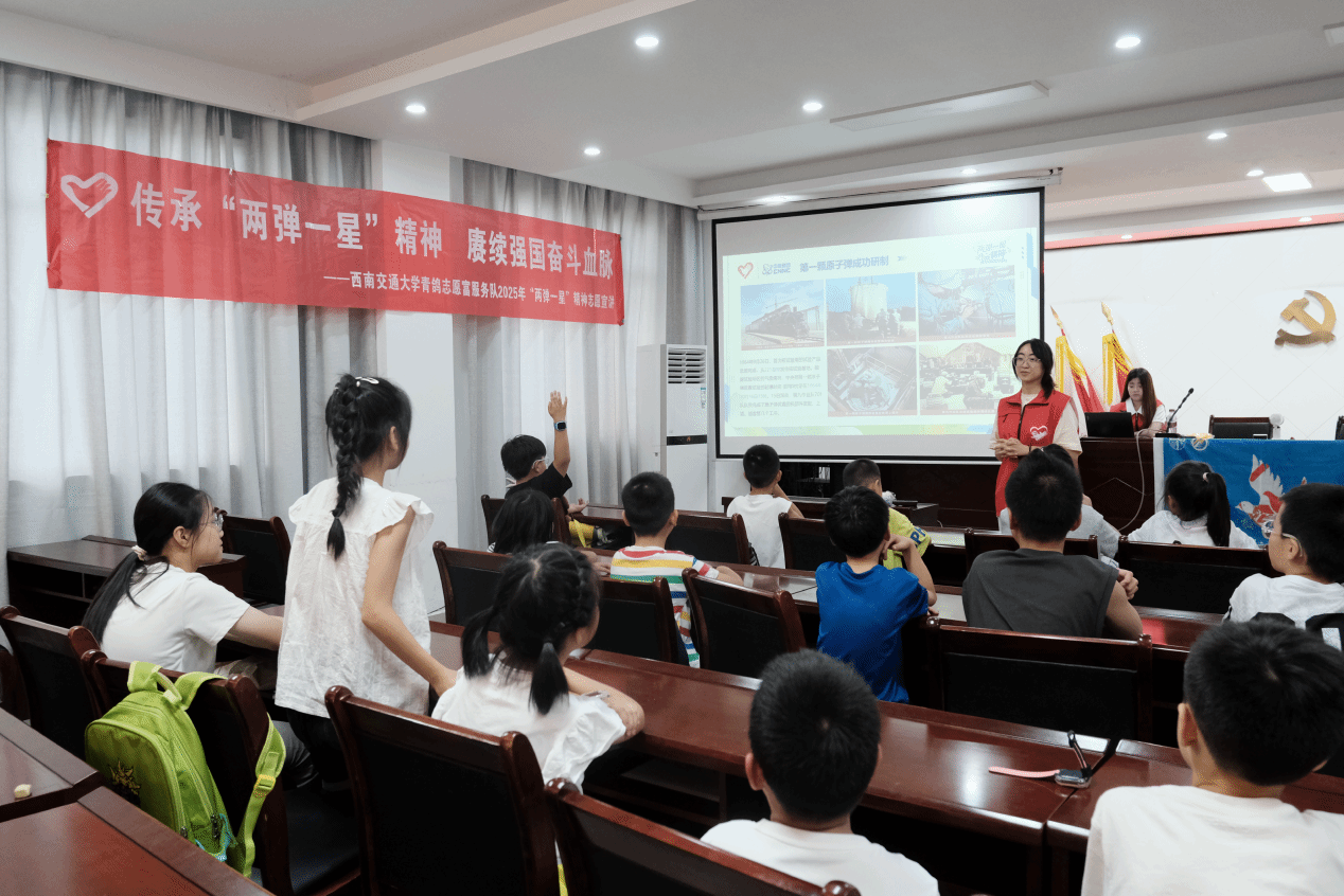“两弹一星”精神宣讲青鸽志愿服务队成员在郫都区安靖镇喜安社区开展2025年“两弹一星”精神志愿宣讲活动。