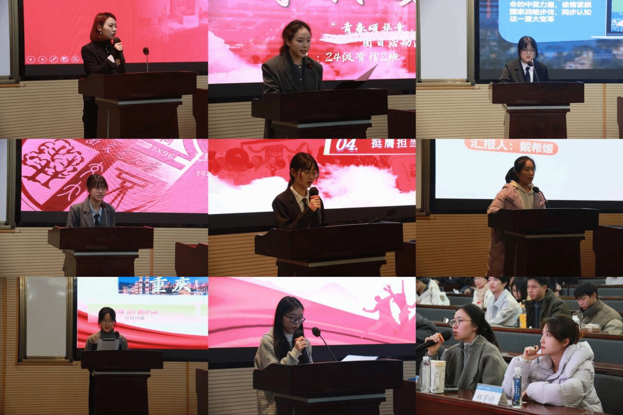 接下来的团支书答辩环节中,各团支部围绕主题全面展示了支部建设成果。各支部不仅回顾了团日活动的精彩片段,更着重介绍了同学们深入重点企业开展行业实践的生动案例。同学们在实践中将专业知识转化为技术创新与社会服务的实际成果,在知行合一中彰显了新时代青年的责任担当。