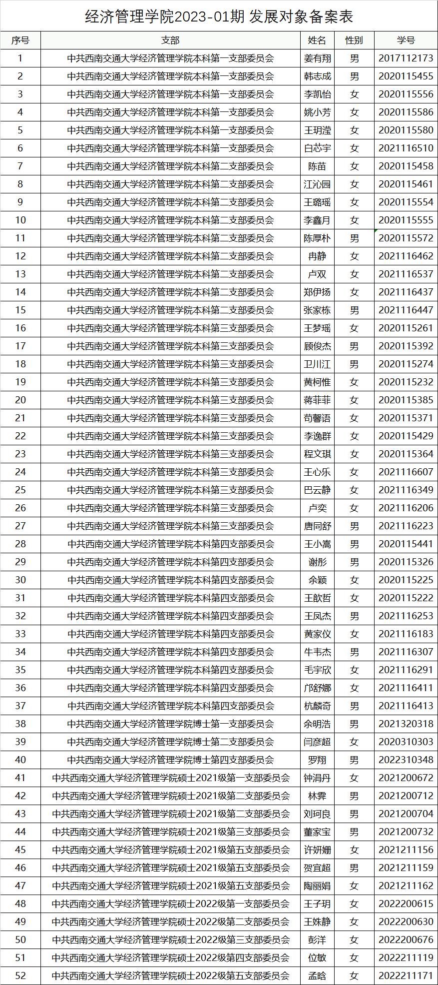 根据《中国共产党支部工作条例(试行)》《中共色色动漫 委员会基层党组织建设工作文件汇编》的有关规定,经过相关党支部全面了解、考察,并经院党委审核,拟将以下52位同志确定为色色动漫 党委2023-01期党员发展对象,现予以公示。