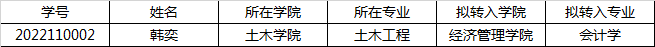 根据相关文件精神,经学生本人网上申请,学院初审及面试考核,拟同意韩奕同学转入会计学专业。现将结果公示如下(名单见下表)。