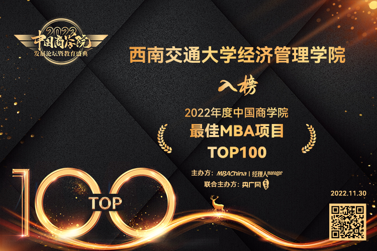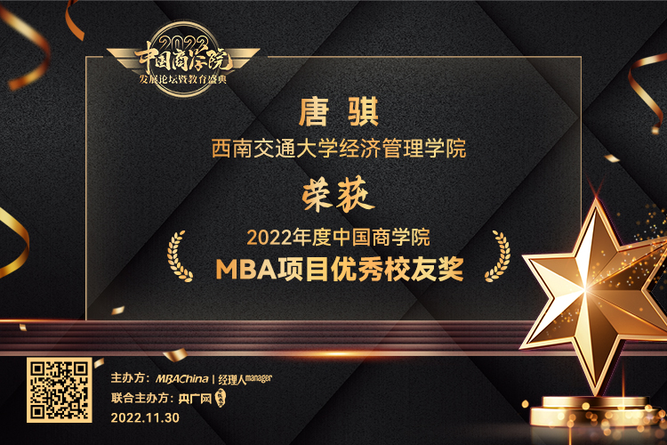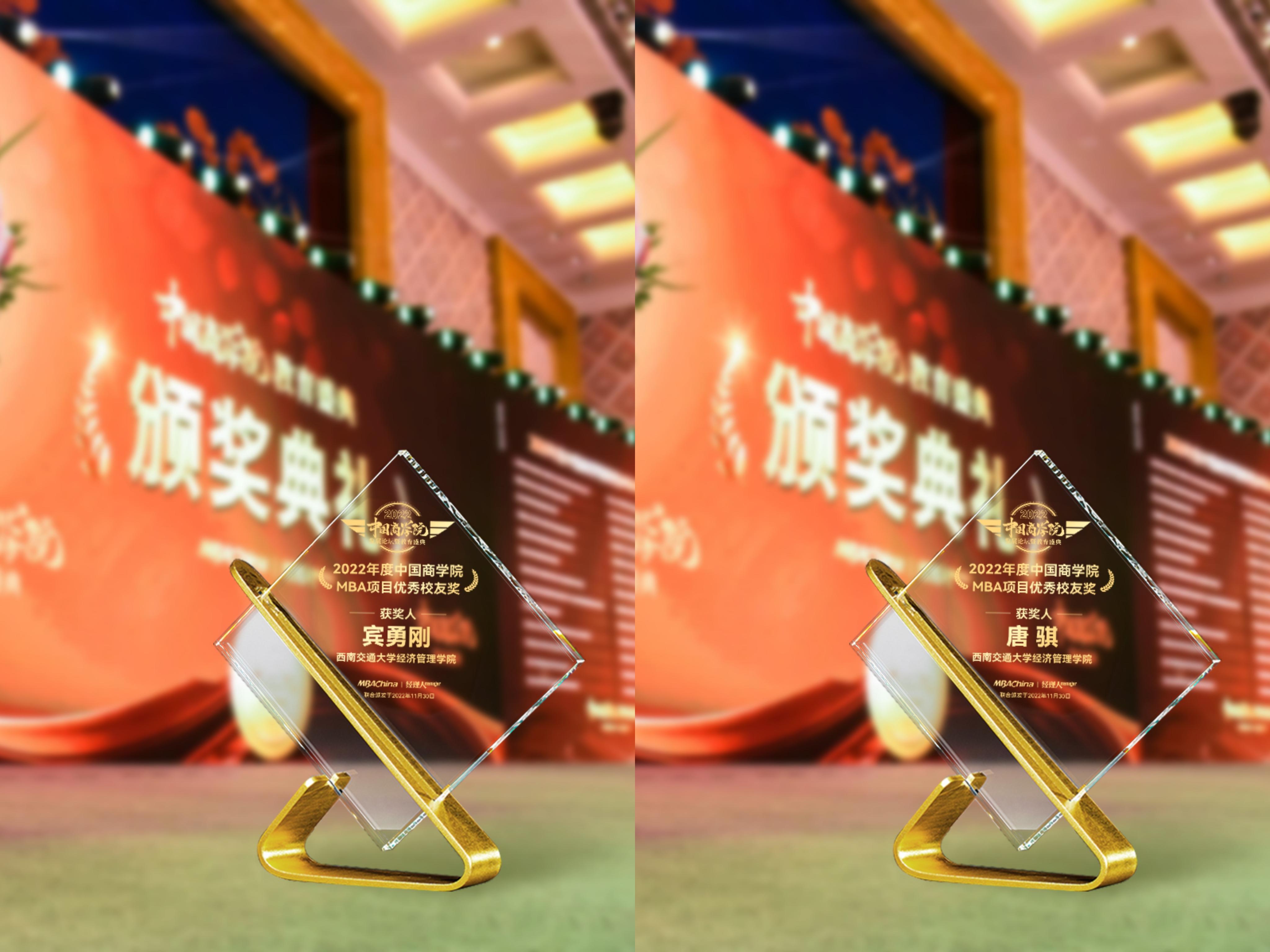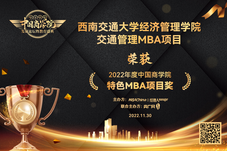 交通管理MBA项目荣获“2022年度中国商学院特色MBA项目奖”;宾勇刚、唐骐两位校友荣获“2022年度中国商学院MBA项目优秀校友奖”。