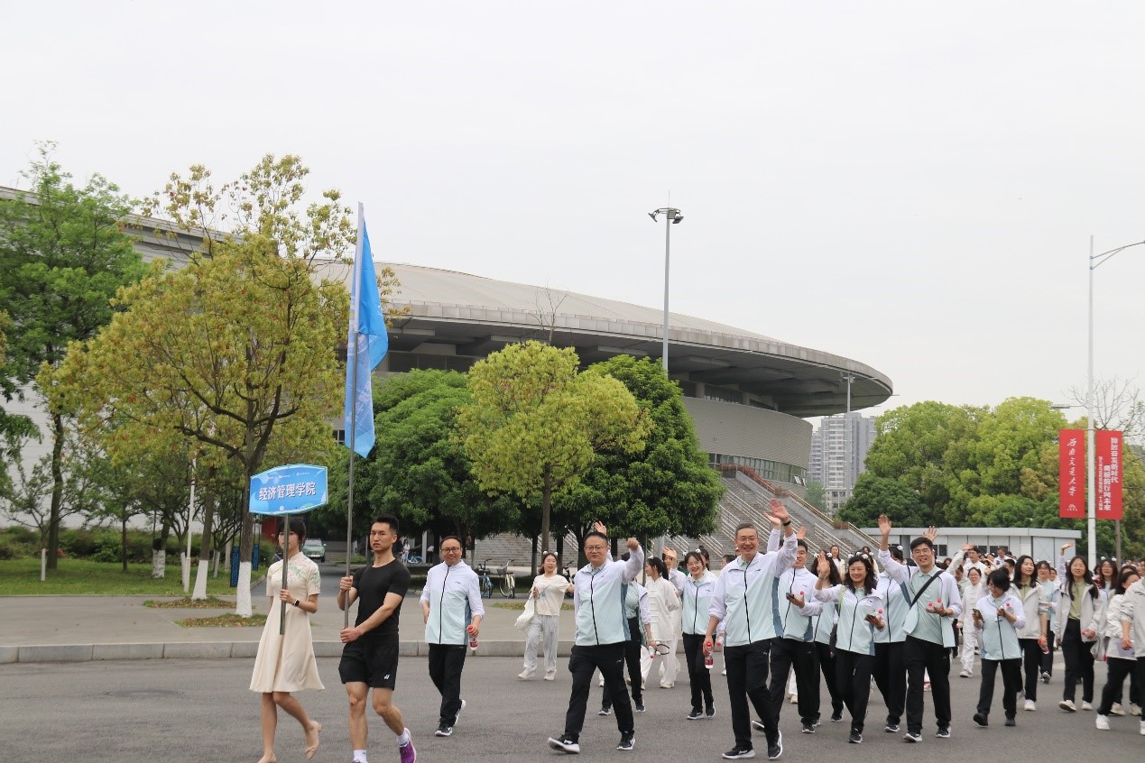 代表队由党委书记王斌、执行院长郭强、党委副书记杨宏毅、党委副书记晏理斌带领。他们朝气蓬勃,用洪亮的声音喊着口号:经世致用,管仲之风;扬我学院,风采无限!师生挺拔的身姿、崭新的风貌、响亮的口号、跟随着代表队前进的大熊猫,处处彰显着色色动漫