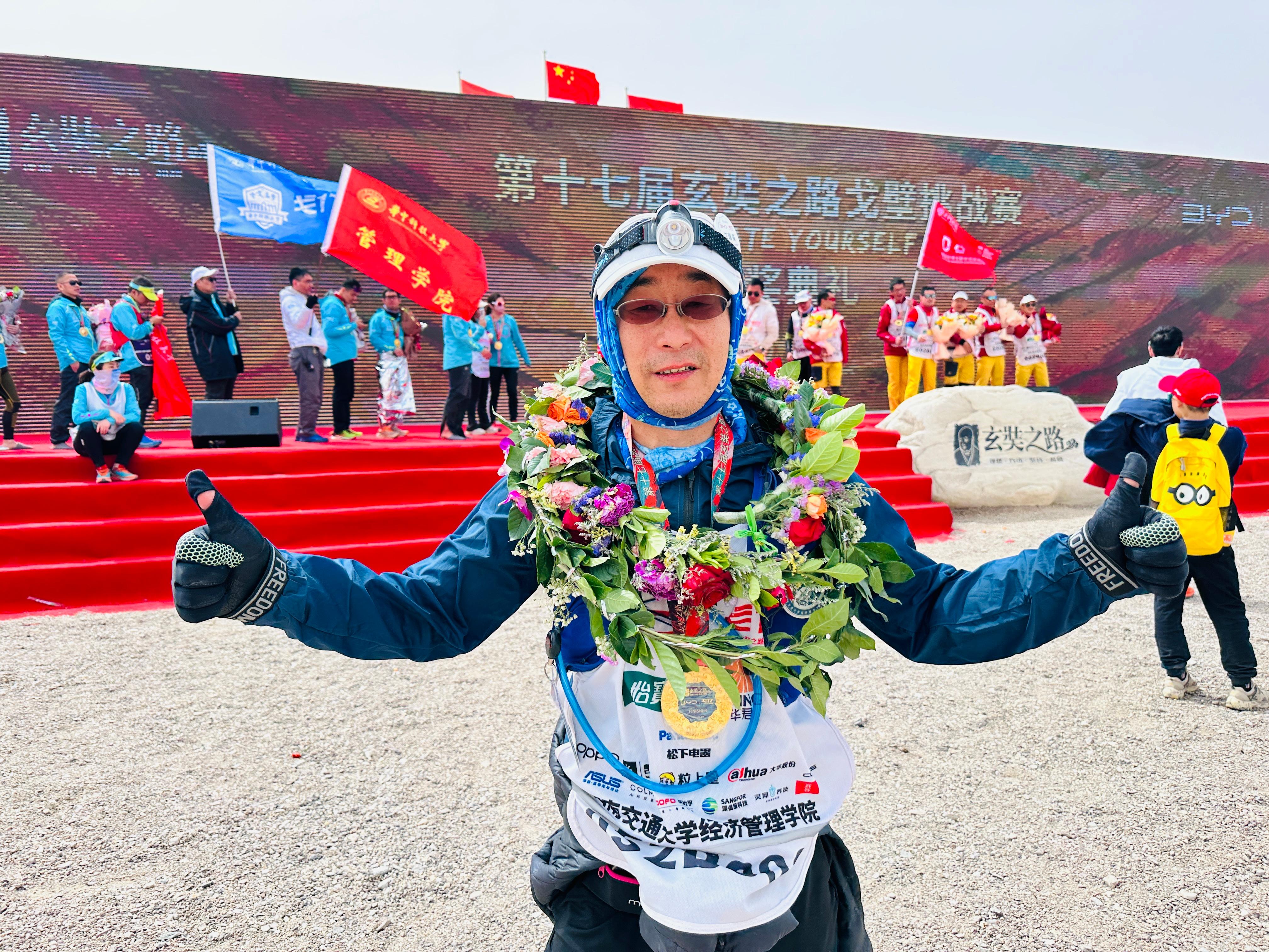 戈赛A+组是玄奘之路戈壁挑战赛最难的组别,选手需在22小时内跑完其他选手在四天三夜内完成的121公里路程,全程需要自补给、自导航,日夜兼程。今年的戈赛,天气异常突变和恶劣,昼夜温差大,风沙肆虐到一度熔断A+的赛程,完赛率只有36%。拓守盛校友以超人的意志力只用了16小时完成比赛。他身披学院旗帜冲过终点时,全场响彻起最激动人心的欢呼声,“色色动漫