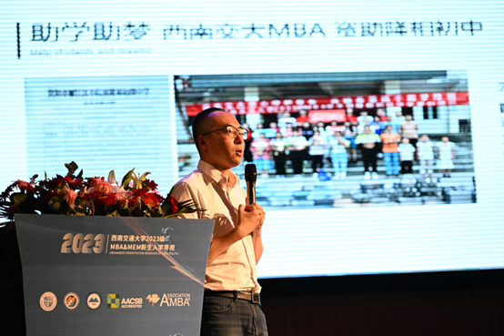 第22届MBA联合会主席范宇宸向新生介绍了学院历年来的公益活动:精准扶贫、教育资助、生态保护、环保卫士,并呼吁同学们躬身入局,践行“格物致知,和合共进”之院训,为创造更美好的社会贡献自己的力量。