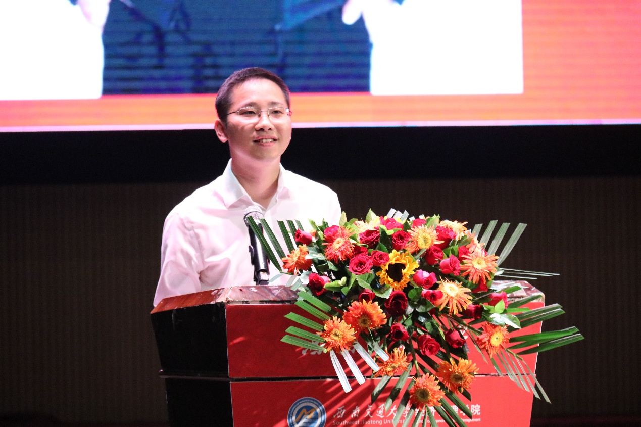 大会第三项,优秀校友代表郑世锋致辞。他分享了在交大学习的心路历程,给同学们献上了真挚的祝福与建议。他提到制定清晰的人生计划并不断为之奋斗的重要意义,由衷地希望同学们能够坚守“竢实扬华、自强不息”的初心与使命,不畏困难,勇往直前,把握青春大好时光,收获精彩大学生活。