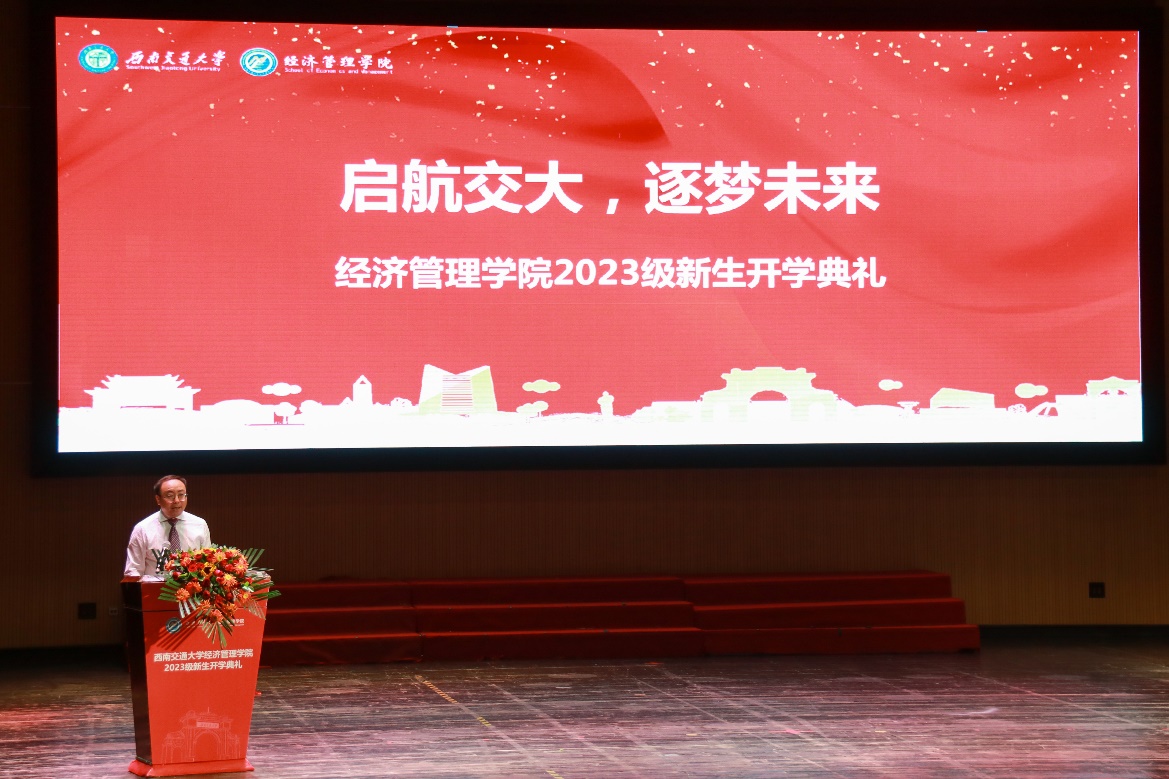 大会第二项,学院执行院长郭强致辞。郭强首先向2023级新生的到来表示热烈的欢迎和由衷的祝贺。他表示,大学不仅要重视知识学习,还要注重品格磨炼、身心健康,他希望大家保持认真勤勉的学习态度,塑造坚毅顽强的品格、怀揣向善向美的追求,不断提升个人的综合素质,成为一个德智体美劳全面发展的卓越人才,做一个富于追求、乐于拼搏、有家国情怀的交大人。