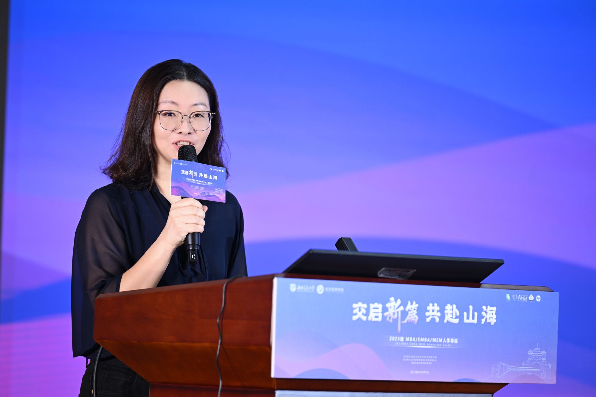 副院长李良以生动的讲述,为新生们展现了学校百年办学历程和学院发展的壮丽画卷。从历史沿革的厚重积淀,到教育创新的蓬勃活力;从学科特色的熠熠生辉,到“竢实扬华、自强不息”的育人传承,学院的每一段历程都秉承“培养具有国际视野的管理人才”的理念。李院长还深入解读了MBA/EMBA/MEM培养体系,并强调,培养目标是为MBA学子打造持续创新力、终身学习力、职业胜任力;为EMBA学子培育全球领导力、商业洞察力、可持续发展力;为MEM学子塑造职业胜任力、创新实践力、领导协作力。这一目标导向,勾勒出一幅国际化视野与创新思维的教育图景,旨在为学生提供全方位、多层次的培养,使其在未来的职业道路上具备强大的竞争力和适应力。