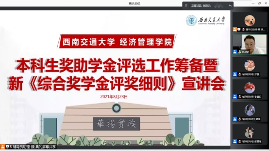 上午9点30分,在参加会议的人员到齐后,会议正式开始,陈建奇老师从奖学金评定工作筹备会的重要性展开介绍。在接下来的会议中,他向参会同学进行了新的《综合奖学金评定细则》宣讲,包括评奖要求、评奖流程和成绩计算等重要内容。同时对即将开始的评奖工作开展布置了具体安排,并在线进行了交流答疑。