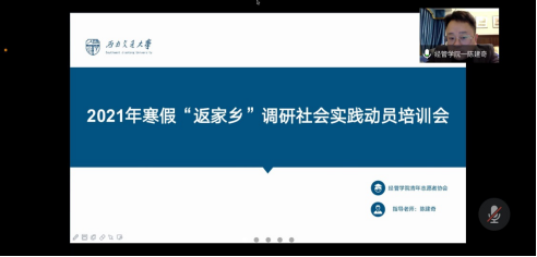 2021年寒假“返家乡”调研社会实践动员培训会在腾讯会议线上如期举行,此次由2020级本科生辅导员陈建奇老师为同学们就此次寒假期间“三下乡”社会实践活动的相关重要事项为话题,和各实践队伍的同学们进行了深入细致的讲解。