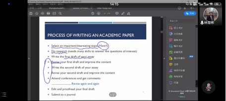 林楚彬老师担任主讲人。林楚彬老师以其风趣幽默的风格和一丝不苟的治学态度广受同学们的喜爱。讲座开始后,林老师首先提出诚信科研,要求同学们遵守学术准则和规范,树立学术道德观。研究生学习阶段是从事科学研究的开始,因此更应该养成好的习惯。随后,林老师就如何发表一篇论文对研究生新生们进行了细致的讲解。从选定主题开始,到具体研究,再到写出初稿,如何一遍遍修改,最后投到期刊。学生们对这件研究生阶段必经之事尤其关心,也因此听得极为认真。在此过程中,林老师毫不吝啬地分享自己的投稿经验,同学们直呼干货满满。作为刚踏进研究生阶段的新生们,未来能否在学术研究方面大放异彩仍未可知,但经过这节通向学术大门的第一课,色色动漫
