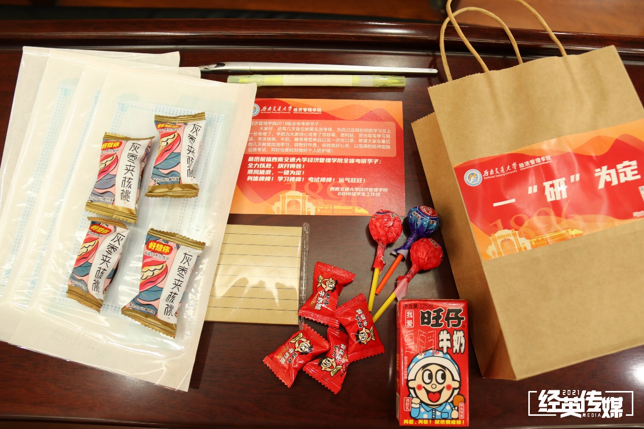 定制高铁笔、便利贴、荧光笔等学习用品,枣夹核桃、旺仔牛奶、糖果等营养品,一次性口罩等防护用品,还有精心准备的祝福贺卡,寓意着金榜题名、牛气冲天、马到成功,祝福考研学子身体棒棒!学习棒棒!考试棒棒!运气旺旺!一次性口罩则是给考研学子送上呵护与关怀,提醒大家在备考复习过程中也要做好疫情防控。