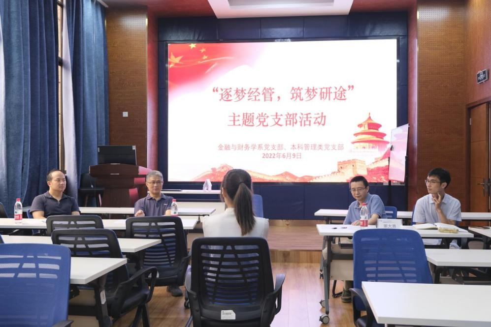 2022年6月9日下午,金融与财务学系党支部与本科管理类党支部于J0218共同举办了“逐梦经管,筑梦研途”主题党支部活动。本次活动由金融与财务学系党支部书记马锋老师指导开展,以研究生升学模拟面试为主,邀请到学院党委委员李良副院长、党委委员周嘉南副院长、朱宏泉教授、董大勇副教授、郭姝辛老师、户晗蕾老师、梁超老师、许自坚老师参与和指导。