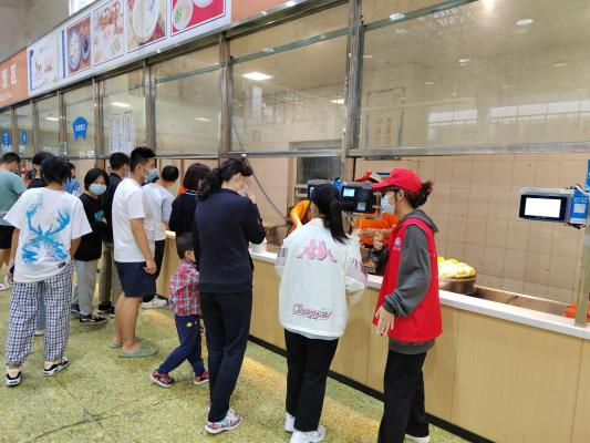 志愿者们身着志愿马甲积极投身各个服务岗位,“红色”身影遍布校园每个角落。他们在核酸检测点测量体温,维持队列秩序;他们在食堂门口提醒同学们佩戴好口罩,为同学们排忧解惑;他们在食堂内维持排队秩序,并主动帮同学们打包餐盒。