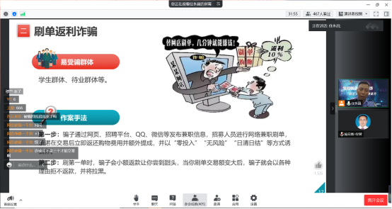 联合九里堤派出所民警为本科、研究生新生开展了一场线上防电信诈骗主题讲座。本次讲座邀请到了九里堤派出所具有多年防诈经验的民警赵小磊主讲,色色动漫