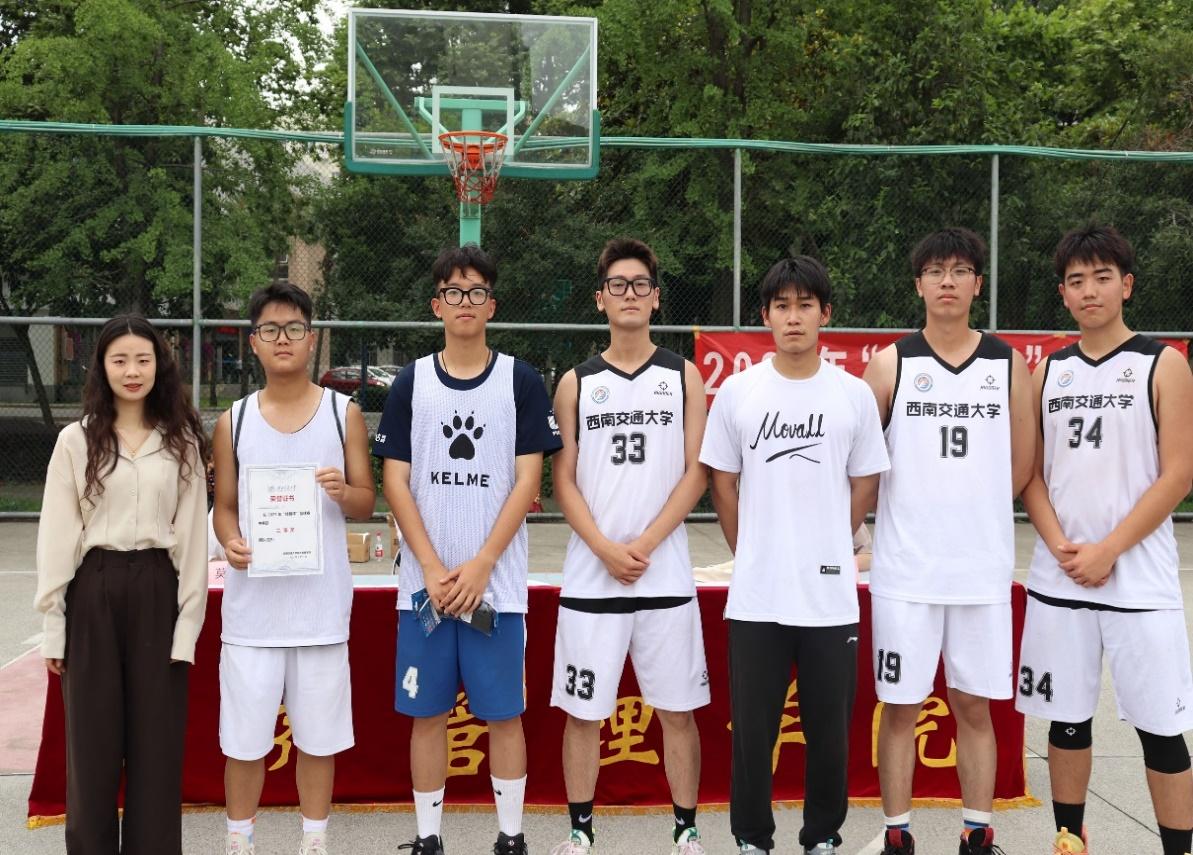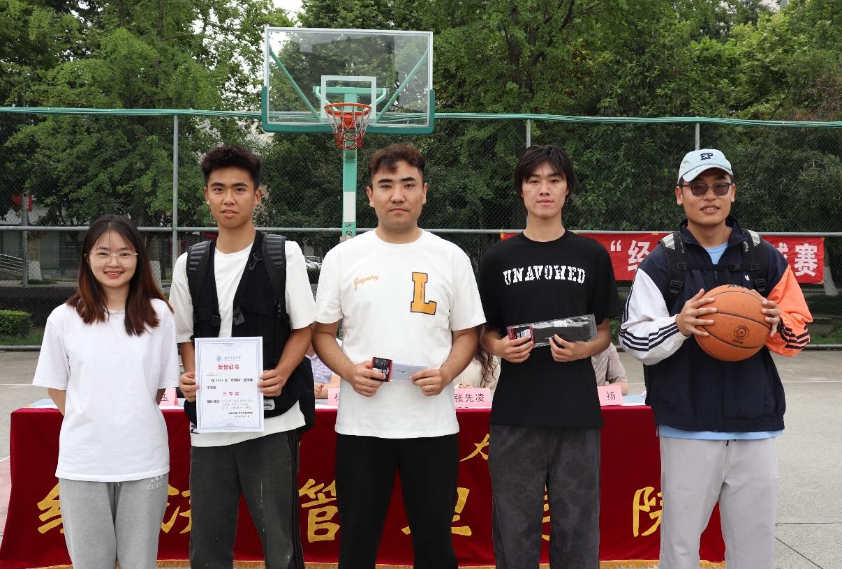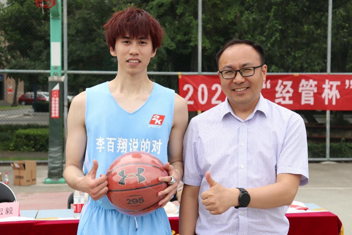 哨声响,赛事始。球员们迅速进入比赛状态,开始了激烈的争夺。双方球员在赛场上默契配合,拼尽全力,充分展现各自夺冠的决心。随着比赛时间不断流逝,场上的气氛愈发焦灼,双方球员争分夺秒,紧抓每一个进球的机会,球员们的精彩表现,赢得场下观众的阵阵热烈欢呼。最终“李百翔说的对队”以48:38的比分取得最终的胜利,赢得最后的冠军奖杯;“hoper在我们队”获得亚军,“有点is队”获得季军。本科2019级信息管理与信息系统专业的贺一鸣同学当选FMVP。