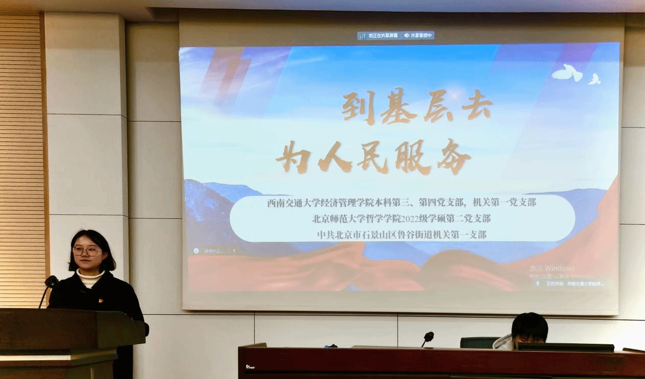 本科第三、第四党支部、机关第一党支部、北京师范大学哲学学院2022级学硕第二党支部、北京市石景山区鲁谷街道机关第一党支部以线上线下相结合的方式开展“到基层去,为人民服务”主题党日活动,本科第三党支部书记苏扬,本科第四党支部书记张先凌,机关第一党支部书记何鹏,以及各支部部分成员于J0215线下参会。