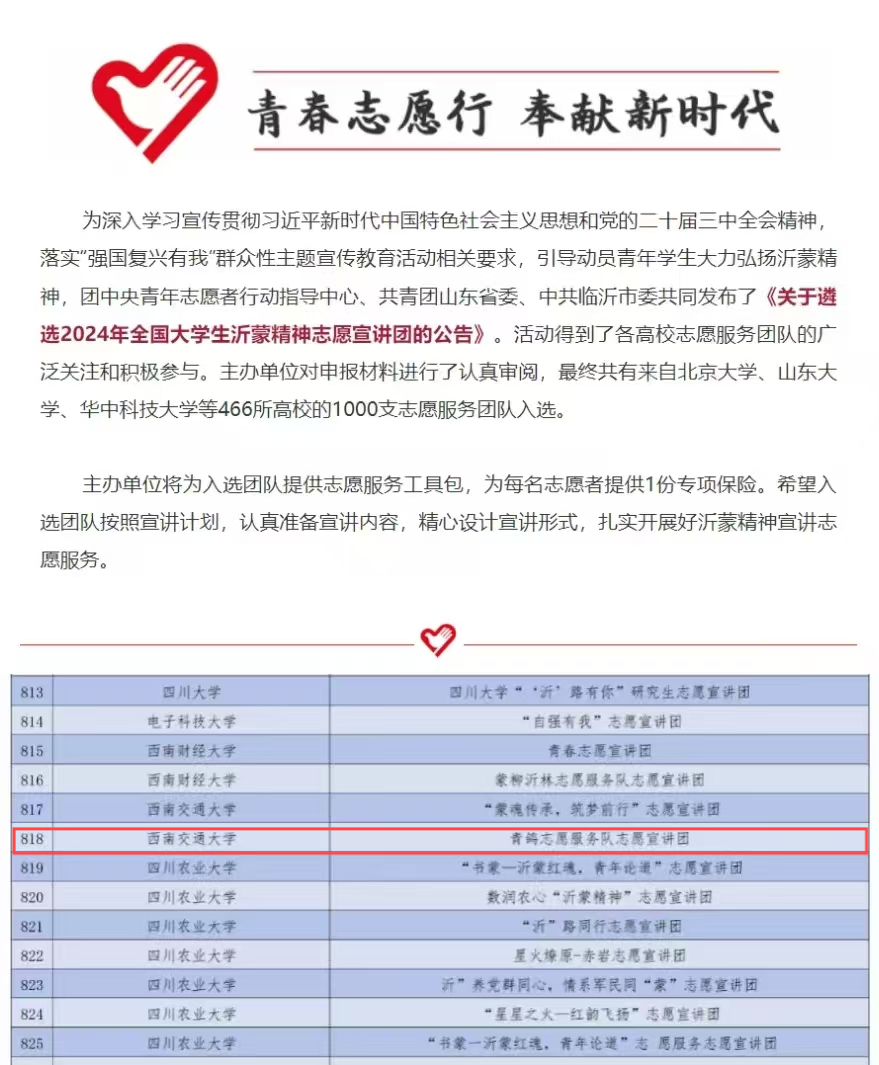 同时,为深入学习宣传贯彻习近平新时代中国特色社会主义思想和党的二十届三中全会精神,落实“强国复兴有我”群众性主题宣传教育活动相关要求,引导动员青年学生大力弘扬沂蒙精神,团中央青年志愿者行动指导中心、共青团山东省委、中共临沂市委面向全国高校遴选2024年全国大学生沂蒙精神志愿宣讲团。