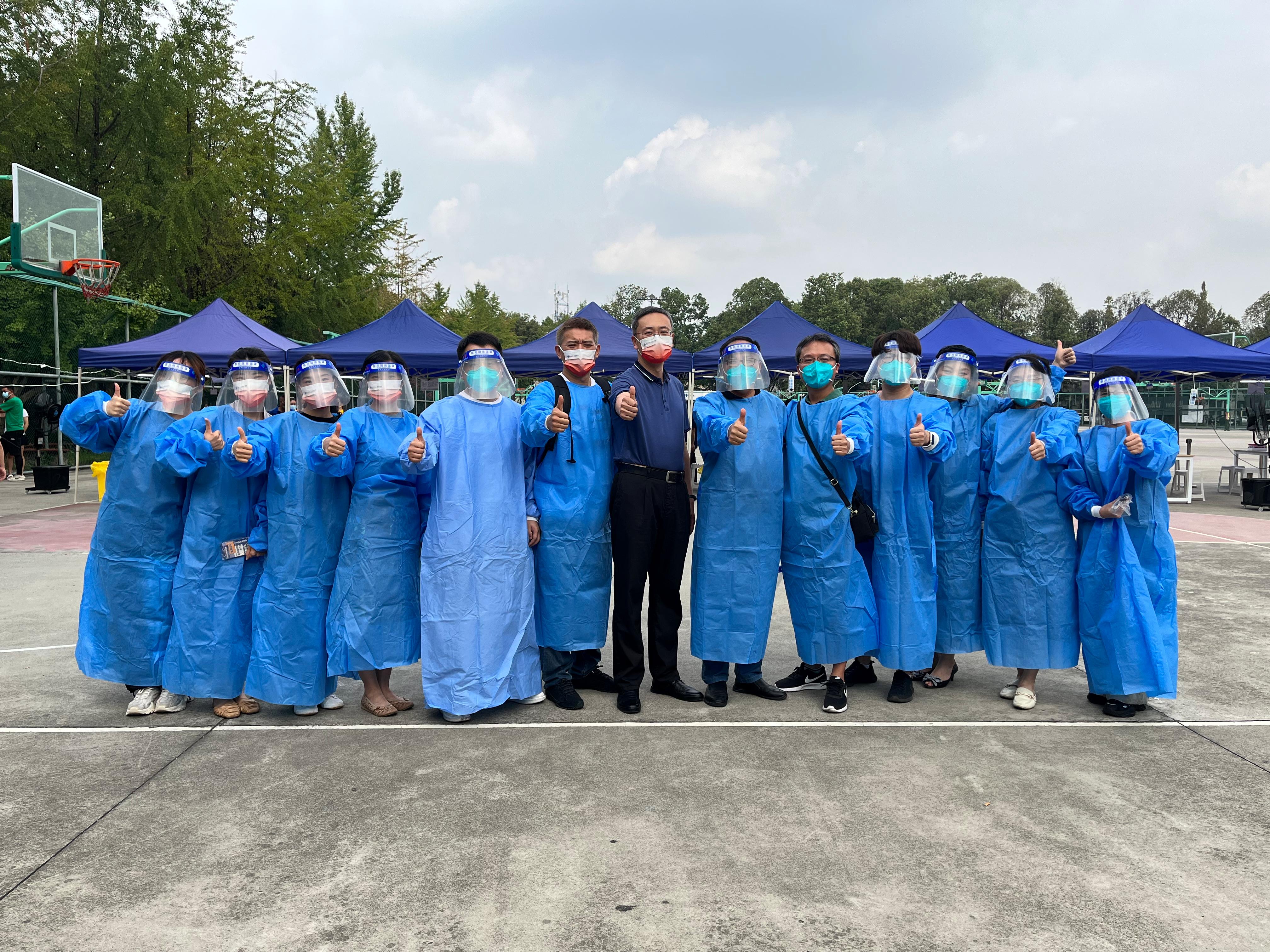 下午3时,学院12名党员志愿者老师在党委书记王斌、副书记杨宏毅的带领下来到核酸检测现场。经学生工作部副部长李毅培训和统一分工后,志愿者们先穿戴好防护用品,随即有序来到分派岗位进行志愿服务工作。