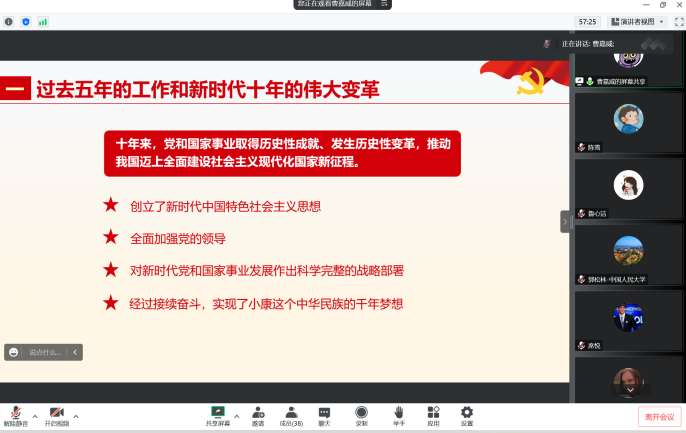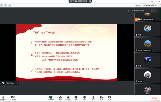 接着由中国人民大学财政金融学院2019级金融博士党支部的宁祺器同志,从三个方面带领大家学习和领悟了党的二十大报告。首先,宁祺器同志从“数”说二十大开始,为党员同志们详细介绍了党的二十大报告中的一些重要内容,其中包括:一个中心任务、第一要务、两个行、两步走、三个务必、三件大事、五项重大原则、五个“必由之路”和六个“必须坚持”。其次,结合报告中引用的一些经典名句,宁祺器同志深入讲解了中国人民的“宇宙观、天下观、社会观和道德观”。最后,宁祺器同志以习近平总书记对青年人的期盼收尾,号召学生党员应把党的二十大报告的学习与自己的学习生活实际紧密结合起来,坚定理想信念,筑牢精神之基,不负时代、不负韶华、不负党和人民的殷切期望。