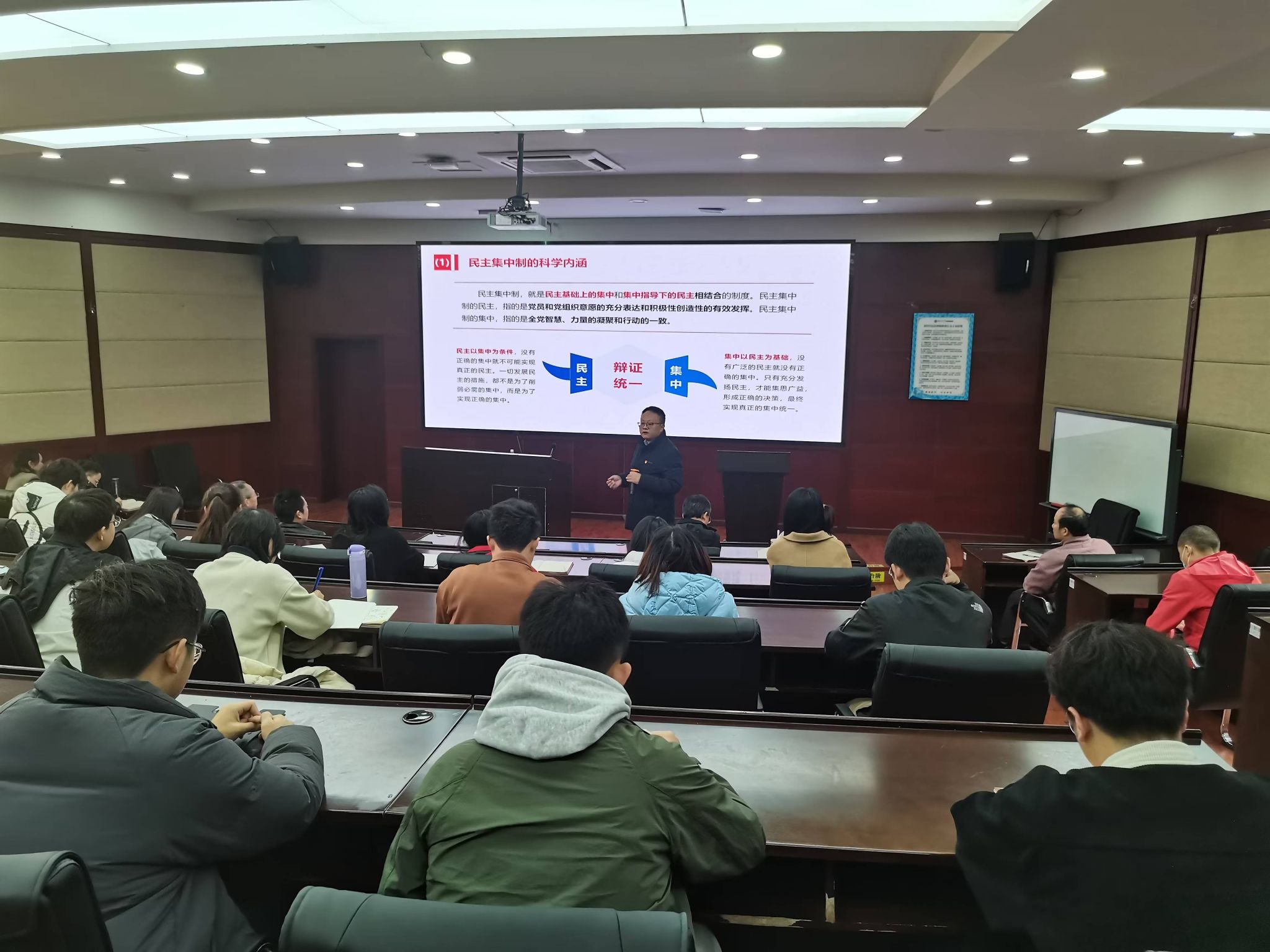党委在零号楼J0228教室开展党委书记讲党课活动,本次专题党课由学院党委书记郭强主讲,学院党委副书记晏理斌、师生党支部委员和党员代表近40人参加了本次党课。