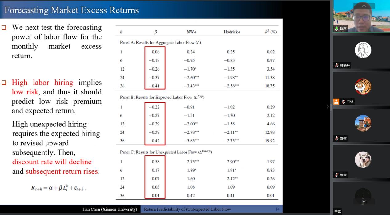 接下来陈坚教授介绍了文章的实证部分,将总体净劳动力流动指标分解为预期和非预期两部分,将其与股票收益做预测回归。实证结果发现预期劳动力流动指标在长期内与股票收益率显著负相关,而非预期劳动力流动指标在短期内与股票收益显著正相关。此外,文章还做了一系列稳健性检验和样本外预测来证明指标的有效性。