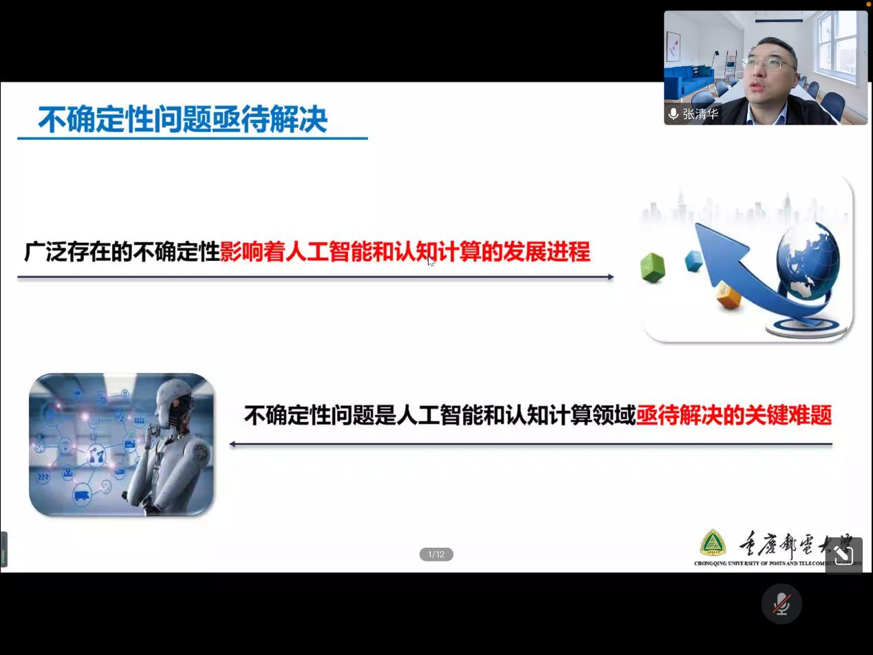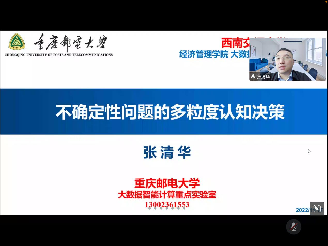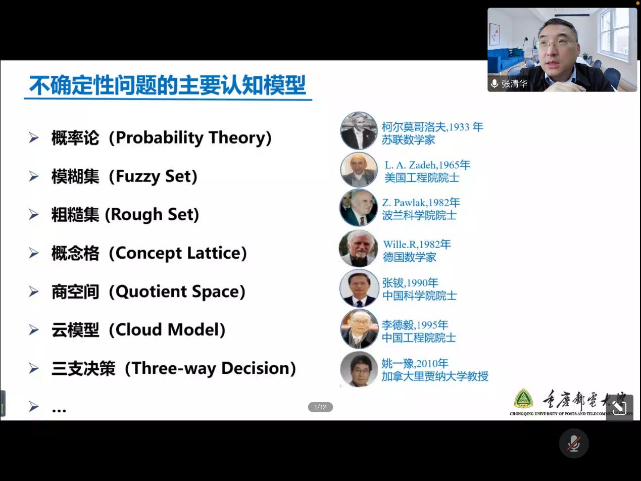 11月17日下午14:00,重庆邮电大学教授张清华应邀以“不确定性问题的多粒度认知决策”为题为学院师生带来了一场精彩的学术分享。本次学术活动由刘盾教授主持,徐进副教授等校内外师生170余人参加了本次讲座。