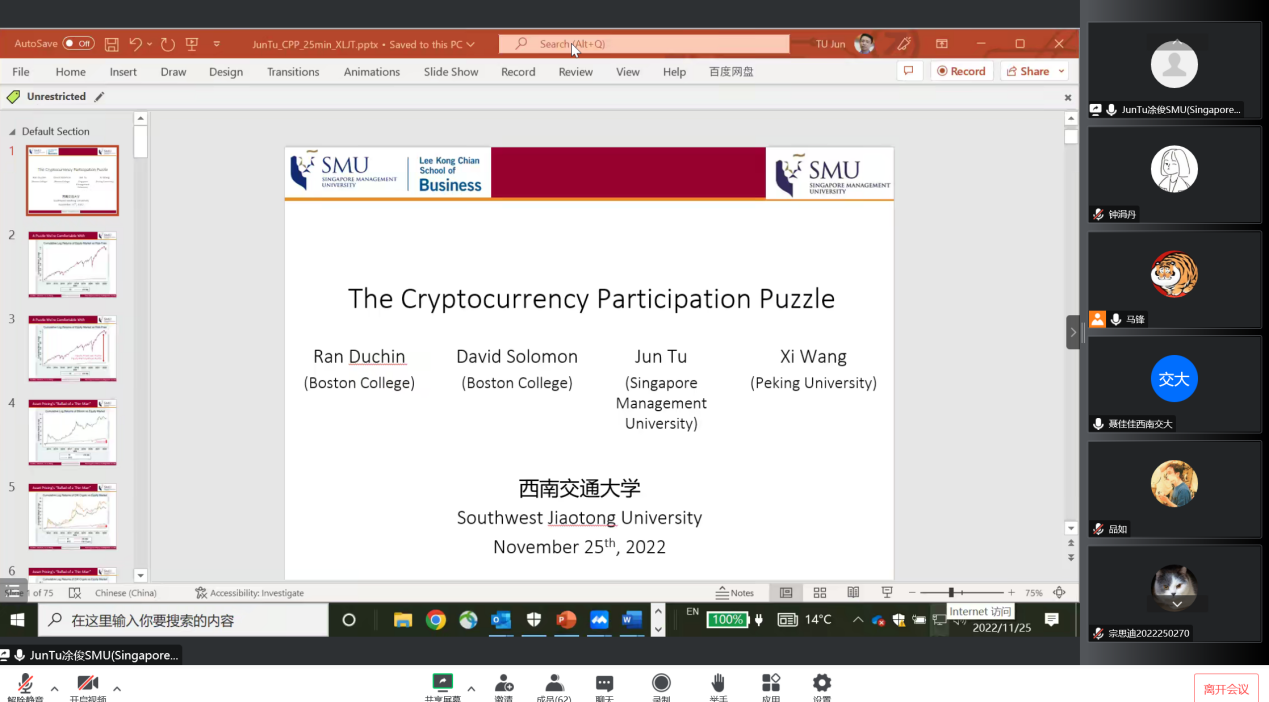 师生以“The Cryptocurrency Participation Puzzle”为主题作线上学术讲座。讲座由副院长聂佳佳教授主持,学院教师及研究生积极参与了本次讲座。
