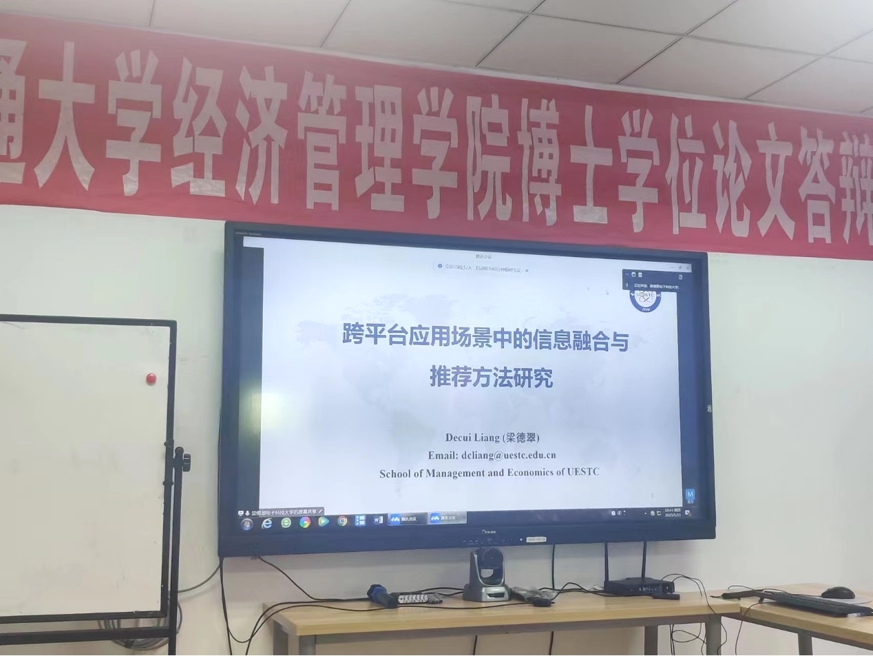 梁德翠,电子科技大学、研究员、博导,英国计算机协会会士(BCS Fellow)、英国皇家艺术学会会士(RSA Fellow)、IEEE Senior Member,先后入选了全球前2%顶尖科学家榜单、天府万人计划、四川省学术和技术带头人后备人选、电子科技大学校百人计划等,担任Journal of Intelligent & Fuzzy Systems等4个国际期刊的副主编和编委。现研究方向为信息管理与商务智能、大数据分析与决策等,已在Omega、IEEE TEM、IEEE SMCA、IEEE TFS、INS、AOR、JORS、CAIE、KBS、ESWA国内外重要主流期刊会议上发表论文百余篇,其中15篇入选ESI高被引用论文/ESI热点论文、SCI检索79篇、SSCI检索26篇,参与编著5部,主持国家自然科学基金项目等纵向项目10余项,主研国家重点研发计划2项。曾获四川省科技进步二等奖1项、四川省哲学社会科学优秀成果二等奖2项和三等奖1项。