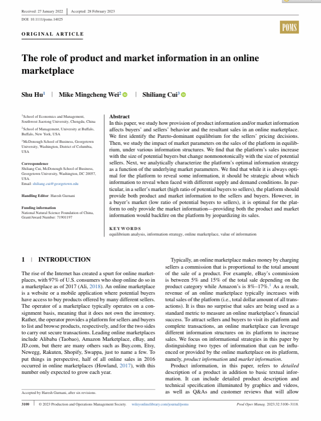 胡书老师于2023年6月在UTD 24期刊Production and Operations Management在线公开发表题为The Role of Product and Market Information in an Online Marketplace的论文。该论文研究了在线市场中产品信息和/或市场信息的提供如何影响买家和卖家的行为以及相应的销售额。论文首先确定了卖方定价决策的帕累托优势均衡。然后,在多种信息结构下分析了均衡状态下重要参数对平台销售额的影响。最后,界定了平台的最优信息策略。文章发现,虽然平台披露某些信息总是最优的,但在面对不同的供需条件时,披露哪些信息应该是战略性的。特别地,在卖方市场中(潜在买家和卖家的比例很高),平台应该同时向卖家和买家提供产品和市场信息。然而,在买方市场中(潜在买家与卖家的比例较低),平台只提供市场信息是最优的--同时提供产品和市场信息只会对平台产生适得其反的影响并损害平台的销售额。