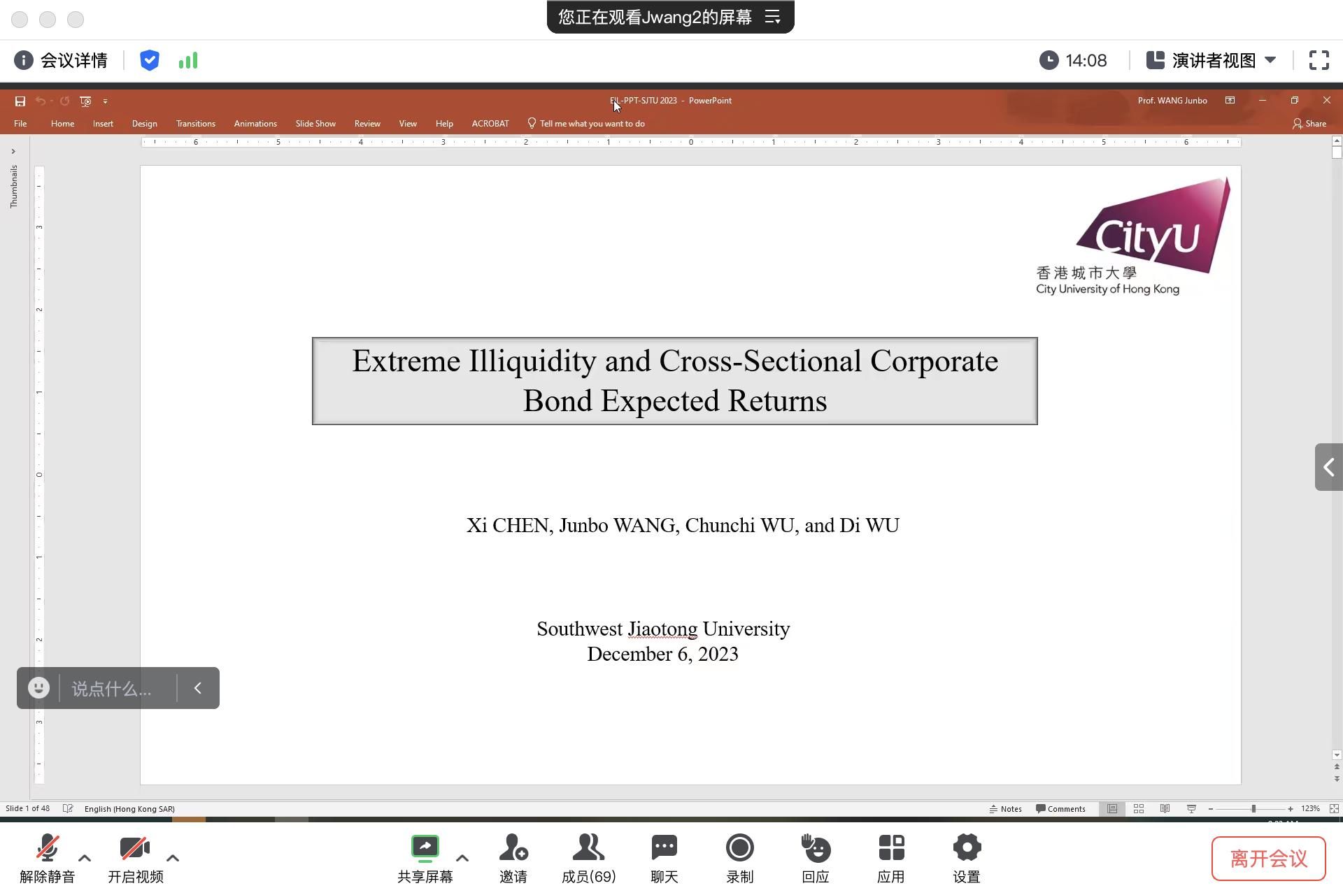 2023年12月6日上午9:00,香港城市大学经济与金融系王军波教授应邀在线上为色色动漫