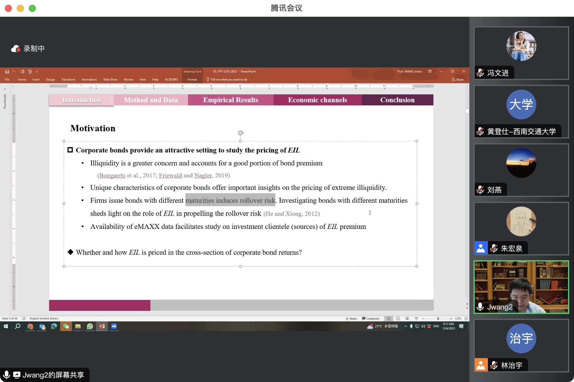首先,王军波教授回顾了以往与流动性和债券市场相关的文献,并研究动机进行了介绍,企业债券回报的横截面是否被ElL定价,定价机制是怎样的?公司债券具有极端非流动性溢价(EIL),EIL在横截面上对未来至少一年的回报具有预测能力。共同基金等主动投资者更偏好在经济不景气时能轻松清算的低EIL债券,而被动机构投资者则增持高EIL债券以获得EIL溢价。虽然将由投资组合构建的EIL因子添加到因子模型中会增加解释力,但其影响在很大程度上被赛马回归中的债券级别EIL所包含。