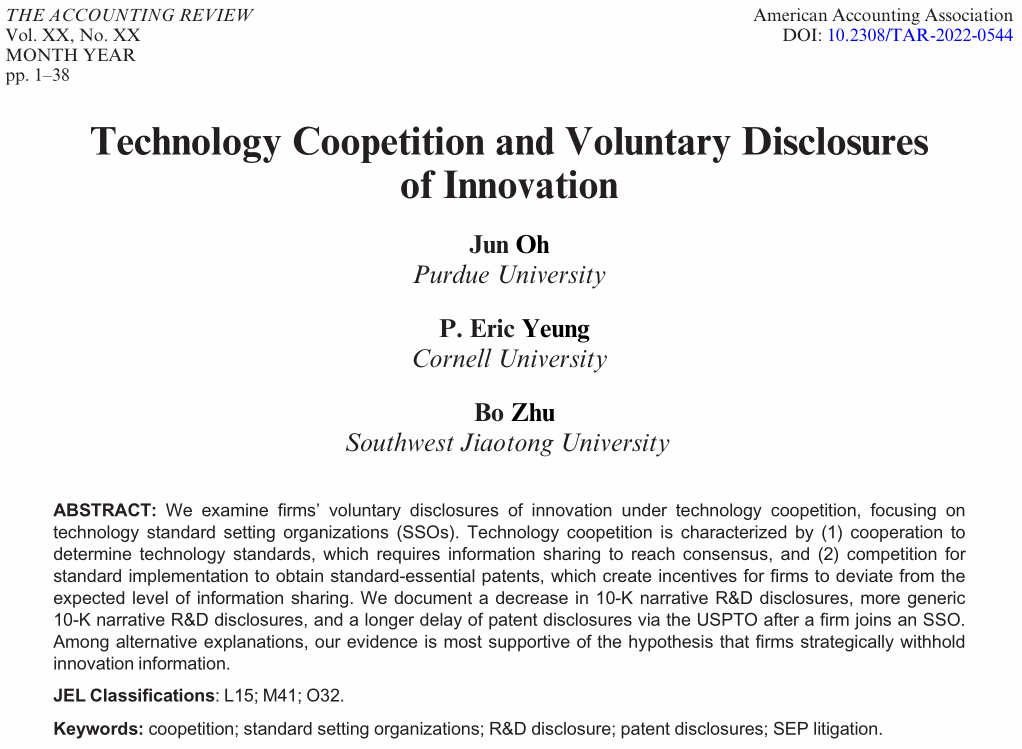 会计学系副教授诸波于2024年8月在UTD 24期刊The Accounting Review在线公开发表题为Technology Coopetition and Voluntary Disclosures of Innovation的论文。该论文以技术标准制定机构(SSO)为研究对象,考察了企业在技术竞合下创新的资源披露情况。技术竞合的特点是:(1)合作制定技术标准,这要求企业信息共享以达成共识;(2)竞争标准执行以获得标准必要专利,这会激励企业偏离预期的信息共享水平。研究发现,在企业加入SSO后,减少了10-K文件中的叙事性研发披露、10-K文件中披露更通用的叙事性研发信息,更长地延迟通过美国专利商标局进行专利披露。论文的实证证据支持企业策略性地隐瞒创新信息披露的假设。