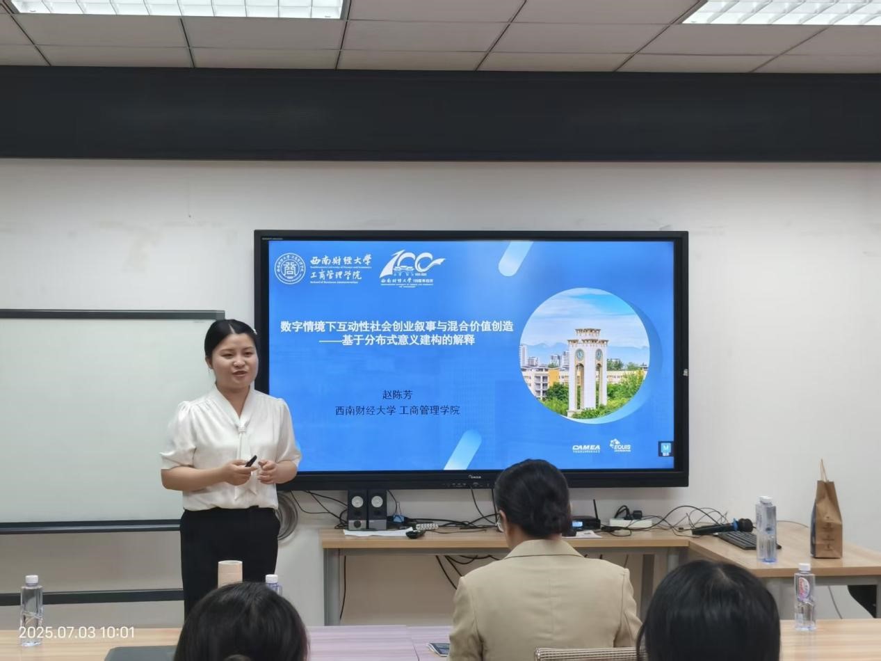 在互动环节,赵老师和现场师生围绕“叙事—情境—认同—价值建构”之间的理论逻辑链条、研究方法、工具变量选取等问题展开热烈互动,并就大家在研究中遇到的具体问题给予了耐心细致的解答。整场讲座视角新颖,剖析了数字创业中如何通过动态叙事建立跨平台、多角色参与的共识网络,为相关领域的研究提供了有力启发。