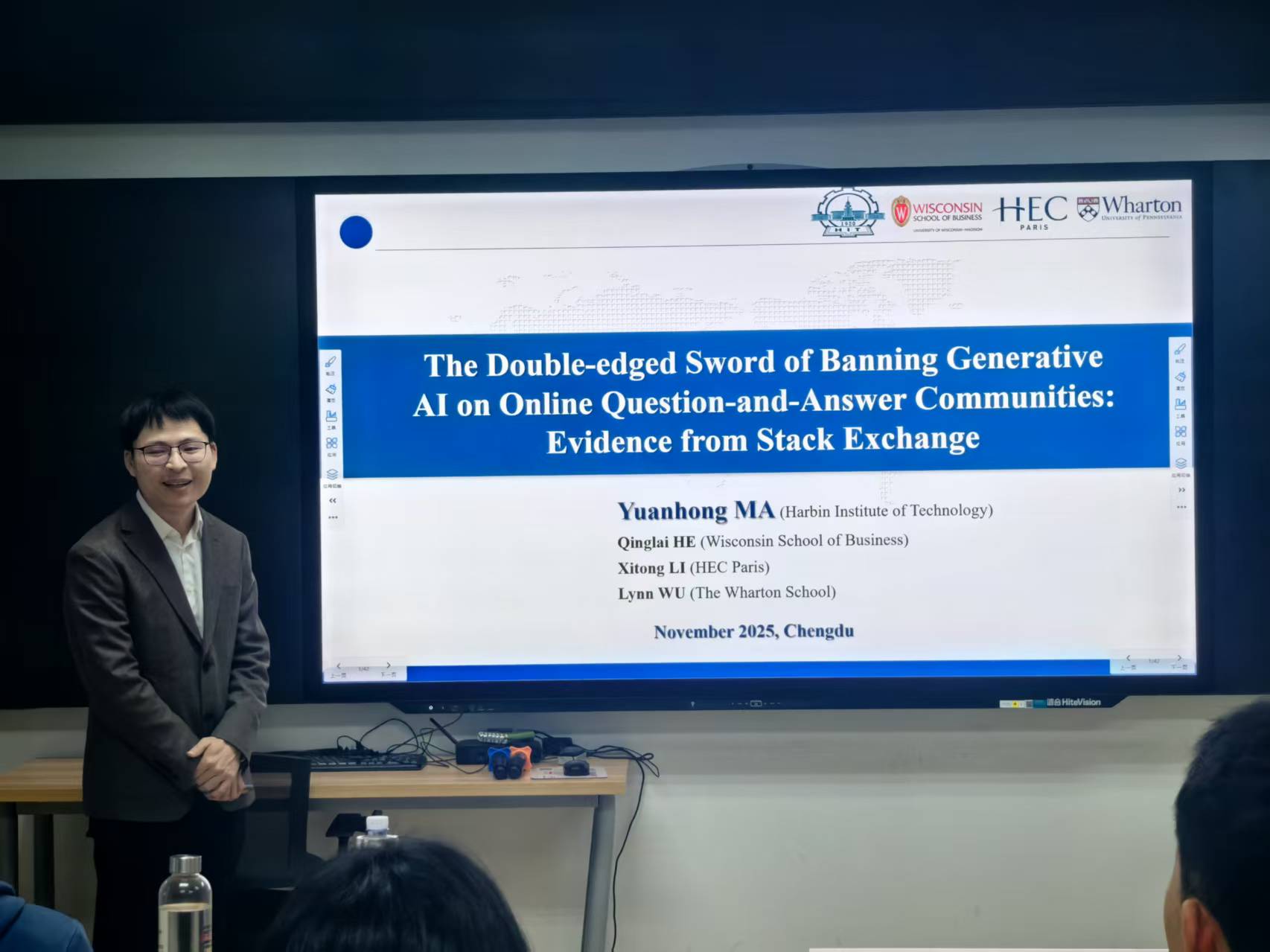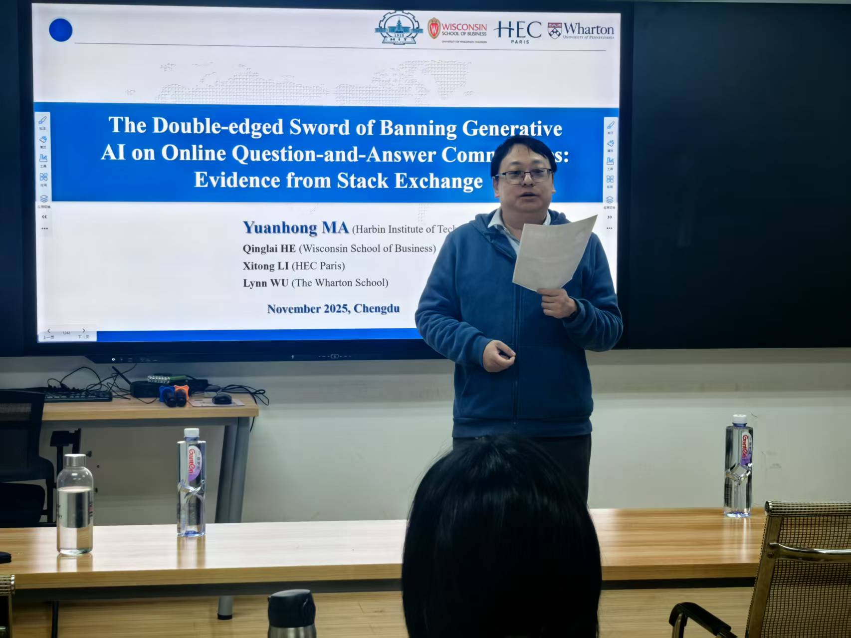 本次讲座围绕两大前沿实证研究展开。马老师首先以“生成式人工智能内容(AIGC)禁令的双刃效应:基于Stack Exchange平台的实证研究”为题,深入探讨了AIGC对在线问答社区带来的影响。随着如ChatGPT等人工智能工具的应用,部分平台开始实施AIGC禁令。马老师通过收集平台数据,运用双重差分法展开实证分析,研究发现:AIGC禁令在提升用户知识需求的同时,也降低了社区的整体回答效率,且这一效应在非STEM类社区中更为显著。该研究为在线社区治理与平台政策制定提供了重要启示。