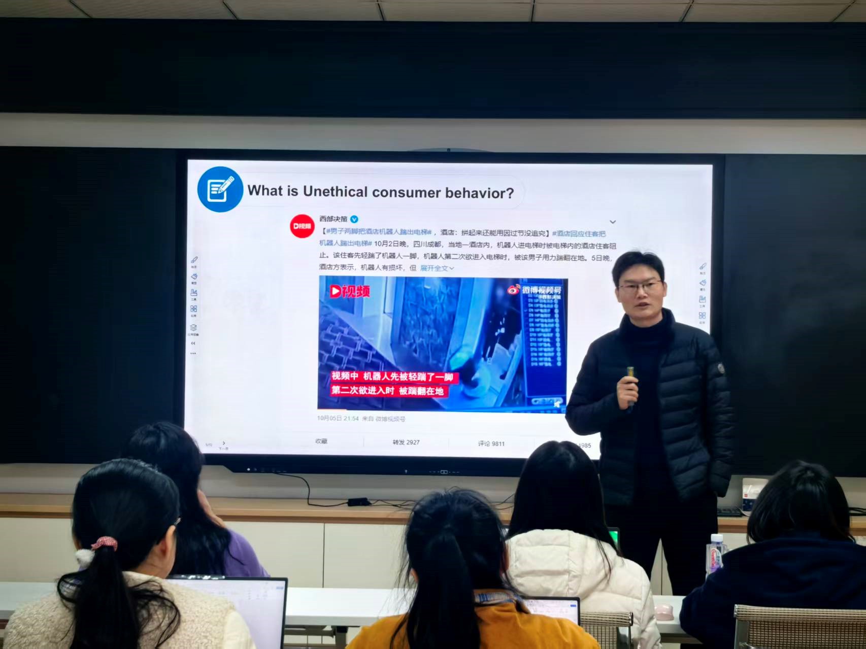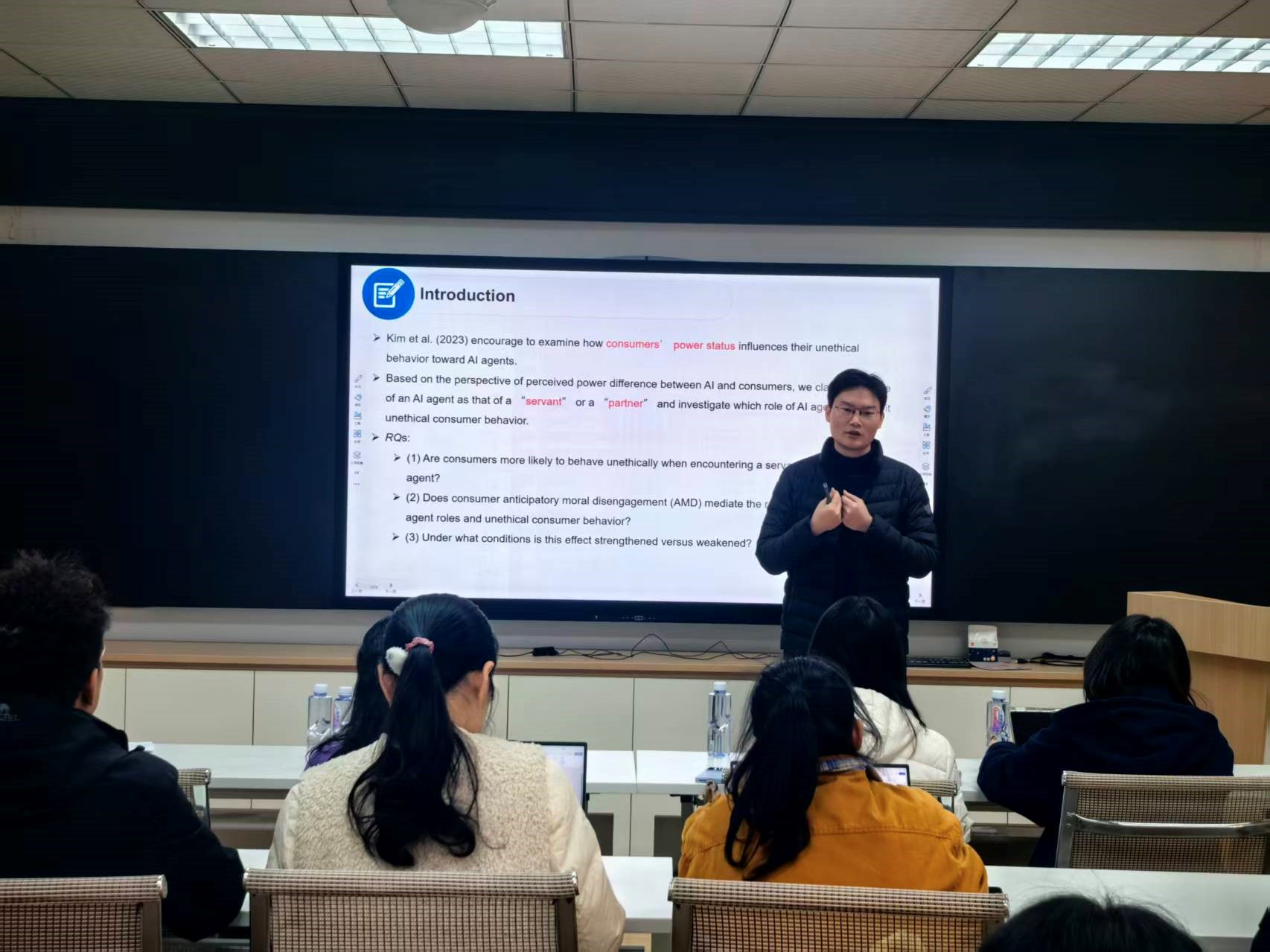 “踏新章 绽华光” 新青年教师系列讲座在九里校区零号楼 0411 室如期举行。本次讲座由市场学系助理教授雷韶辉主讲,聚焦 “AI 技术应用背景下的消费者伦理问题”。该系主任范春梅副教授主持讲座,学系部分师生参加了此次讲座。