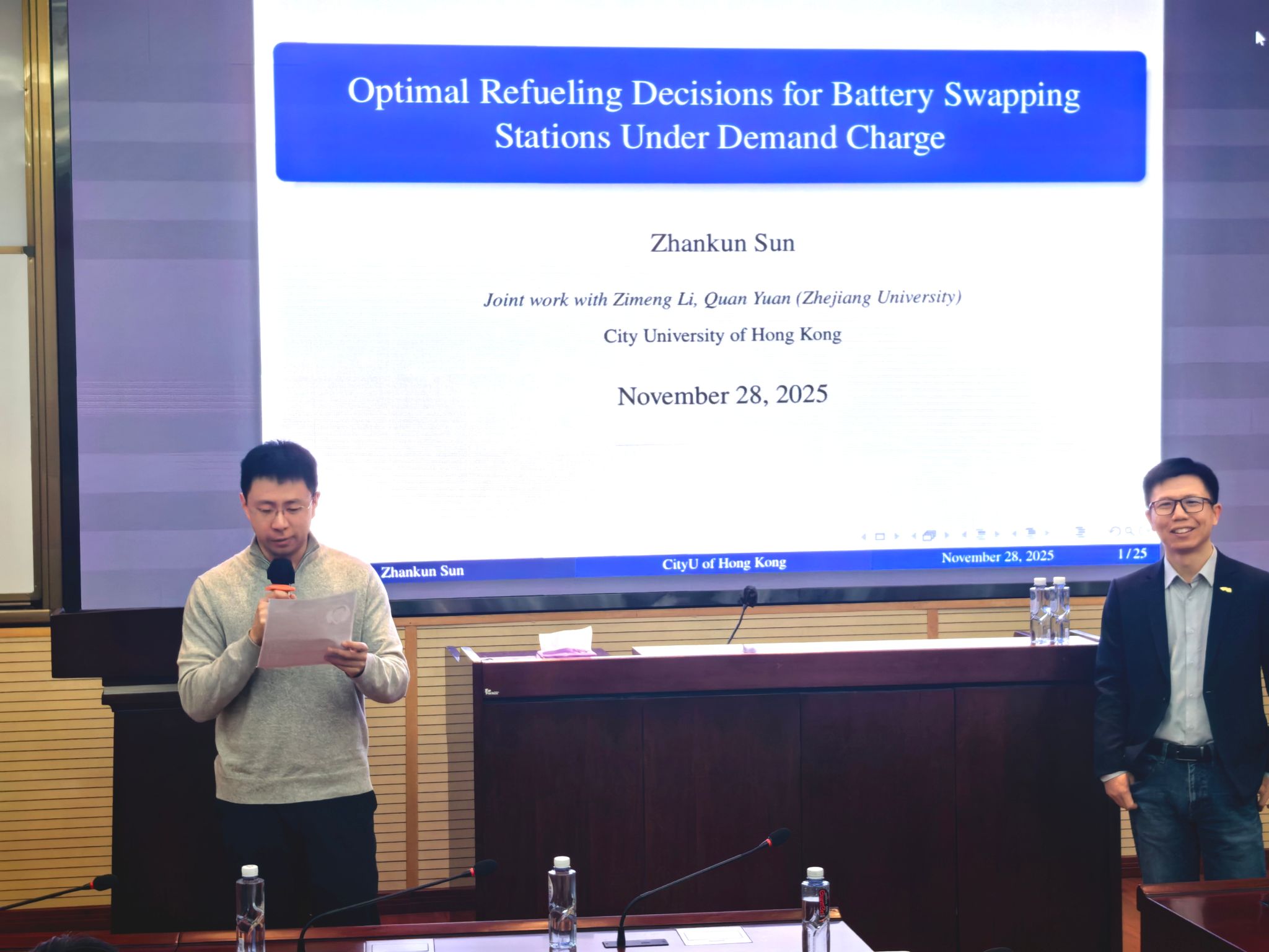 在报告环节,孙老师围绕新能源汽车补能服务品质提升的关键挑战进行了深入剖析。他指出,换电为新能源汽车提供了一种快速能量补给解决方案。在综合考虑客户到达的随机性、可再生能源发电的不确定性以及时变电价等现实因素的基础上,孙老师又结合充电峰值需求水平与常规电能消耗成本,将需量电费纳入换电站运营成本,并以此构建有限阶段动态规划模型,确定了换电站电池最优充能决策。