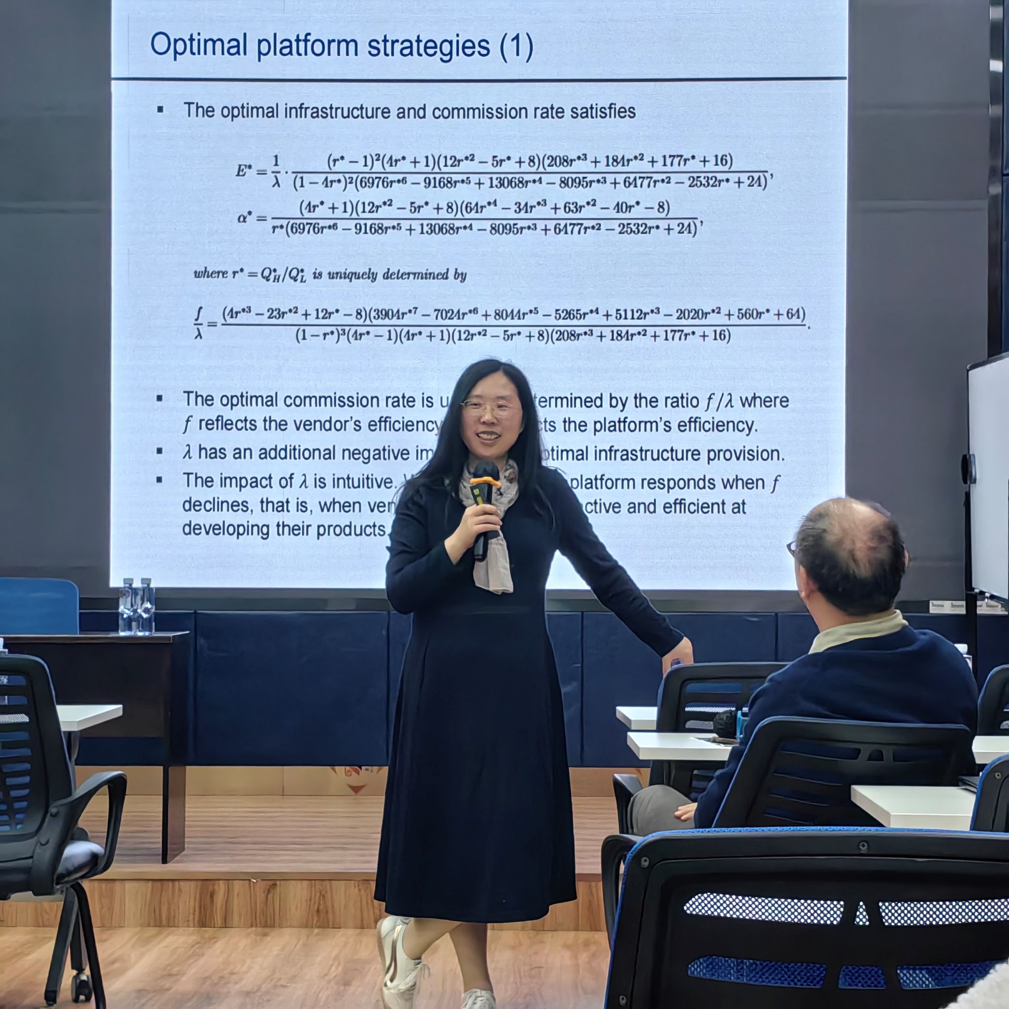 在报告环节,李老师首先介绍了团队的最新研究——源于实践的医疗运营管理(OM)研究,从门诊排队优化、就医流程再造到患者出院后康复项目设计,这些扎根产业的课题为团队后续研究筑牢了现实洞察的基石。随后,她将焦点转向本次分享的核心论文,拆解了研究的核心概念框架,该论文聚焦数字商品市场中共同平台上的纵向竞争问题,探究了平台基础设施供给与佣金定价、厂商个体属性打造之间的互动策略,不仅发现平台基础设施升级会引发高低质量厂商个体属性 “分化式” 调整(高品厂商强化、低品厂商弱化),还揭示了厂商研发成本变化下平台的非单调策略响应,最终论证了平台策略与厂商技术进步结合可实现平台、厂商、消费者三方共赢的格局,为数字平台生态下的竞争与协同提供了全新理论视角。