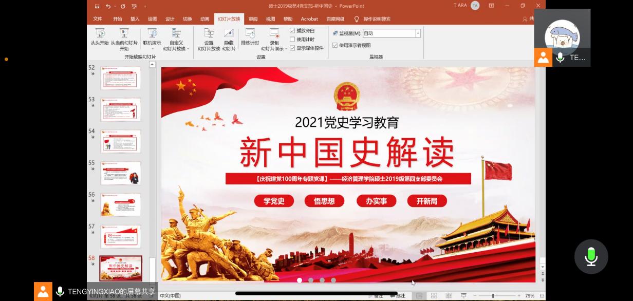 硕士2019级第四党支部开展了云上党组织生活会。本次会议主题为“新中国史解读”,支部全体同志依托腾讯会议平台集中进行了学习。