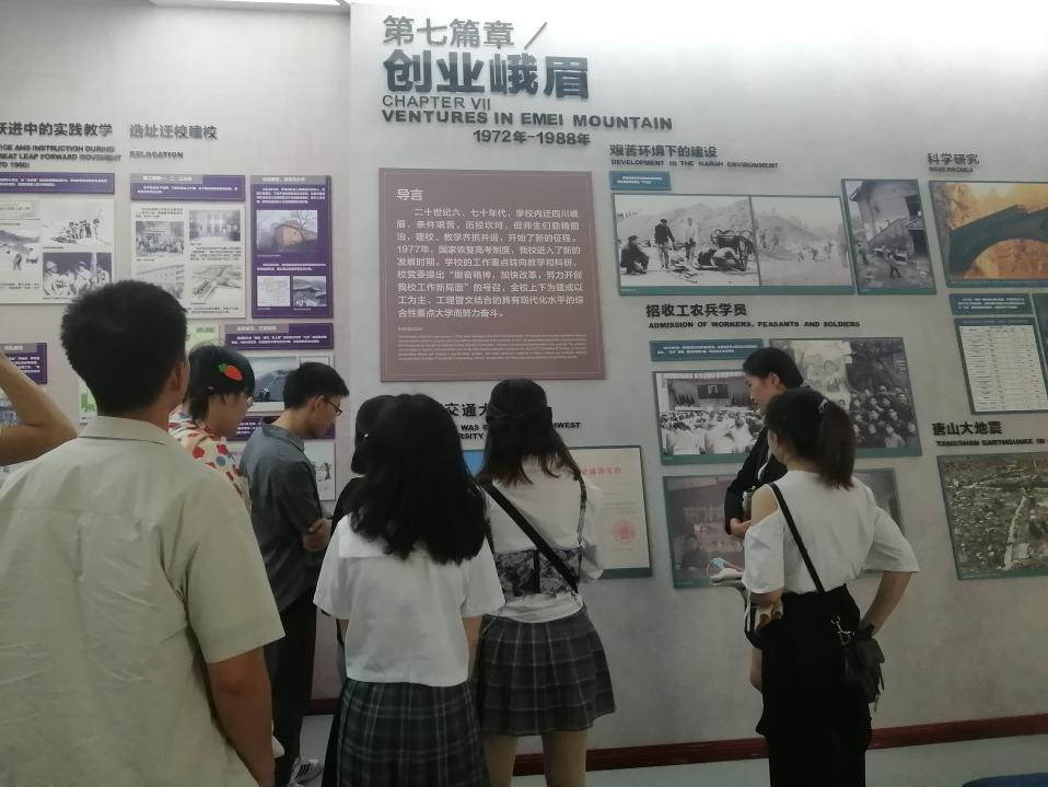 在随后的讲解中,我们了解到了“一班四院士”的事迹、抗战时期的交大多次搬迁、“交大五老”以及知名校友茅以升、竺可桢、林同炎、黄万里的卓越功绩。二十世纪六、七十年代,学校内迁四川峨眉,条件艰苦,历经坎坷,但师生们励精图治,建校、教学齐抓并进,开始了新的征程。1977年,国家恢复高考制度,我校进入了新的发展时期。1979年,我校开始规划建设成都校区,1989年,总校迁往成都。2002年在成都犀浦建设新校区,遂形成今日“一校、两地、三校区”的办学格局。