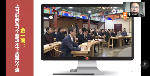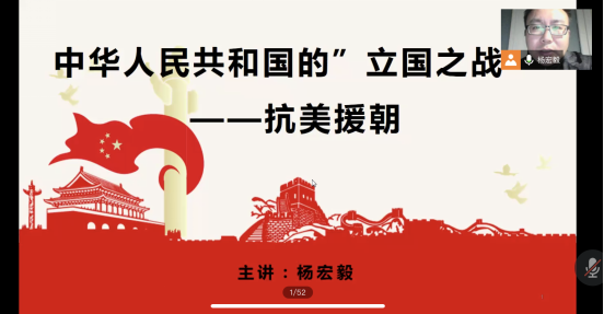 本科经贸类党支部、硕士2018级第三党支部、硕士2019级第四、五党支部、硕士2020级第一、三党支部、博士2020级党支部均全程在线。杨老师分别从抗美援朝战争的基本情况、志愿军司令人选的确定、上甘岭战役的数据等方面向我们讲述了抗美援朝战争中的细节,全程持续100分钟。